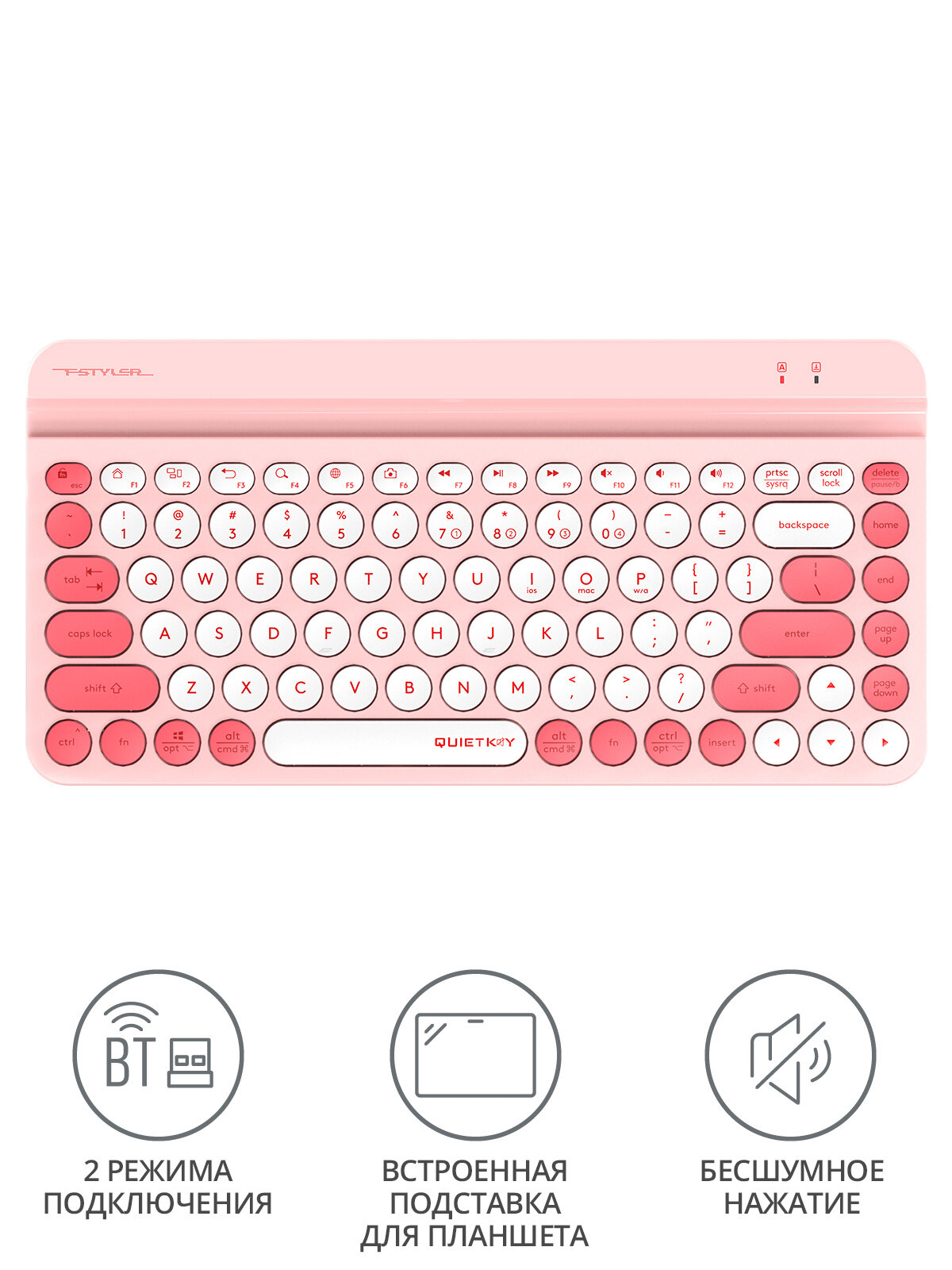 Эта стильная розовая беспроводная клавиатура с круглыми клавишами станет украшением любого рабочего или игрового стола. А ещё она обеспечивает максимально тихое использования благодаря применённой технологии QUIETKEY, которая снижает шум от нажатий клавиш с 35 до 14 дБ. Благодаря компактным размерам эта 86-клавишная клавиатура очень удобна и проста в транспортировке. А дополнительные мультимедийные функции в сочетании с клавишей fn позволяют ускорить взаимодействие с компьютером.