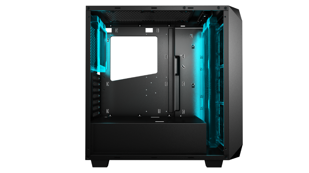 В комплекте с корпусом идёт 3 вентилятора диаметром 120 мм с подсветкой для установки на передней панели, также подключить можно 2 вентилятора диаметром 140 мм. В общей сложности в корпусе возможно размещение до 6 кулеров: 3 на передней панели, 2 сверху и 1 на задней панели.