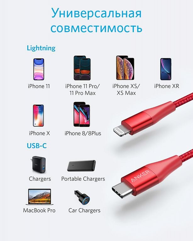 Кабель зарядный Anker PowerLine+ II USB-C to LTG 6ft Red - кабель с повышенный прочности, который может использоваться как зарядный или для передачи данных и синхронизации. При разработке аксессуара, главной задачей инженеров было найти решение, которое сделает шнур максимально прочным. Длина шнура в 90 см является оптимальной для использования кабеля дома или в офисе. Особенности кабеля Anker PowerLine II Гибкая нейлоновая оплетка обеспечивает надежную защиту сердечника. Основание штекеров имеет усиленную структуру, что практически исключает возможность появления изломов. Сам коннектор также рассчитан на несколько тысяч соединений. Поддержка быстрой зарядки USB-C Power Delivery, обеспечивающей зарядку iPhone X на 50% за 30 минут. В результате лабораторных испытаний было установлено, что кабель выдерживает 30000 изгибов. Сертификация MFI, что гарантирует полное соответствие требованиям для зарядки устройств Apple.