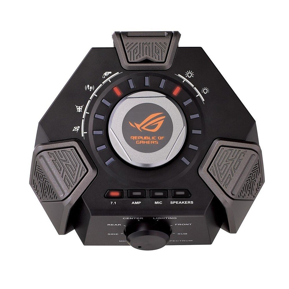 К гарнитуре ROG Centurion прилагается специальная USB-станция – внешняя звуковая карта, в которой реализована современная технология шумоподавления, поддержка нескольких профилей с настройками и усилитель для наушников.