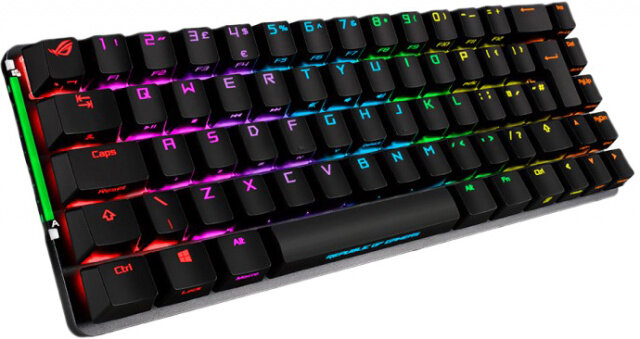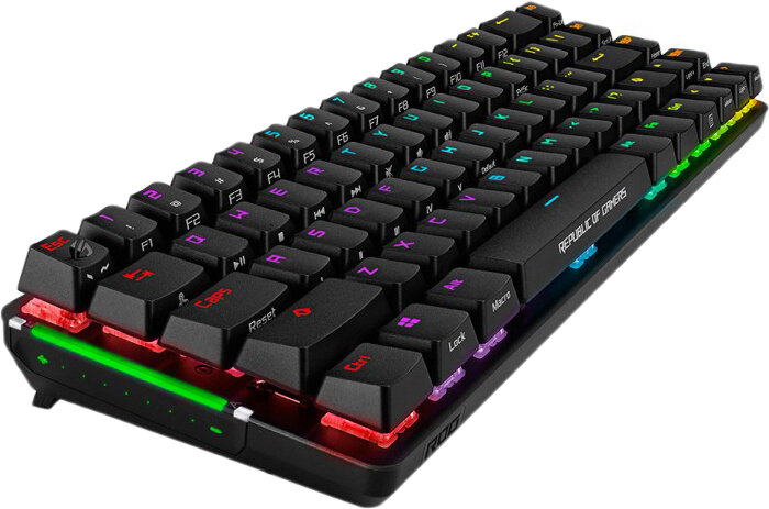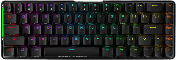 ASUS ROG Falchion - это компактная игровая клавиатура с беспроводным подключением. Благодаря форм-фактору 65% она не займёт много места на рабочем столе, не потеряв своей функциональности. Для каждой из её 68 клавиш можно настроить собственную подсветку типа Aura.