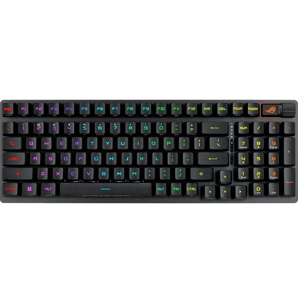 Беспроводная игровая клавиатура ROG Strix Scope II 96 Wireless: три интерфейса, горячие клавиши для стриминга, дополнительные элементы управления, механические щелчковые переключатели ROG NX Storm с нанесенной смазкой и поддержкой горячей замены, стабилизаторы ROG, звукопоглощающая пена, три угла наклона, подставка под запястья.