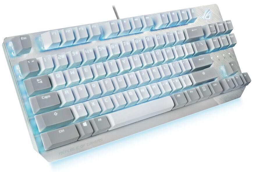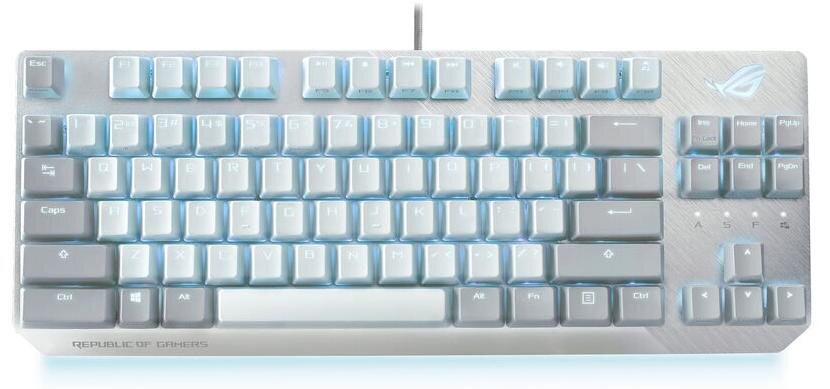ROG Strix Scope NX TKL Moonlight White – это механическая клавиатура высокого класса, выполненная в компактном форм-факторе, без цифрового блока клавиш. Благодаря этому она оставляет больше места для размашистых движений мышью, которые часто приходится совершать на низком уровне чувствительности сенсора при точном прицеливании. Верхняя панель устройства выполнена из прочного алюминия с красивой текстурой поверхности.
