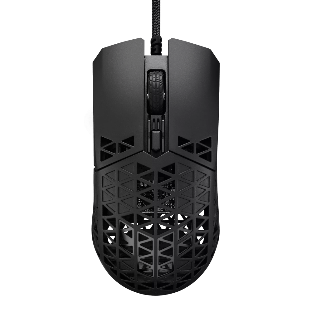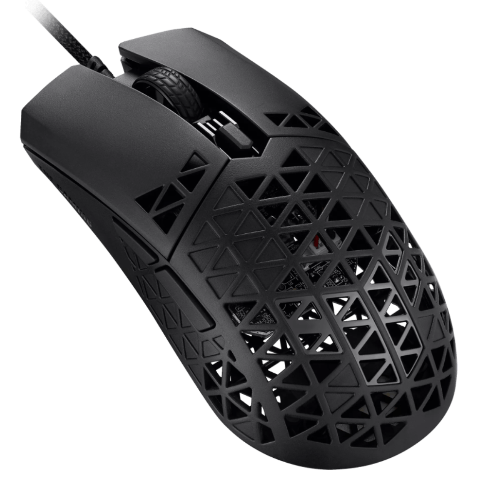 Ультралегкая проводная игровая мышь: разрешение сенсора – 16 000 точек на дюйм, шесть программируемых кнопок, корпус Air Shell, водостойкость по стандарту IPX6, антибактериальное покрытие ASUS, кабель Paracord, тефлоновые ножки.