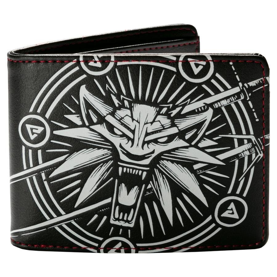 Кошелёк выполнен по мотивам игры The Witcher 3. На его лицевой стороне изображены одни из самых значимых символов игры: знак Школы Волка, мечи Геральта и руны. Внутри теснение в виде логотипа игры.