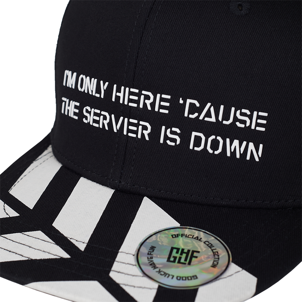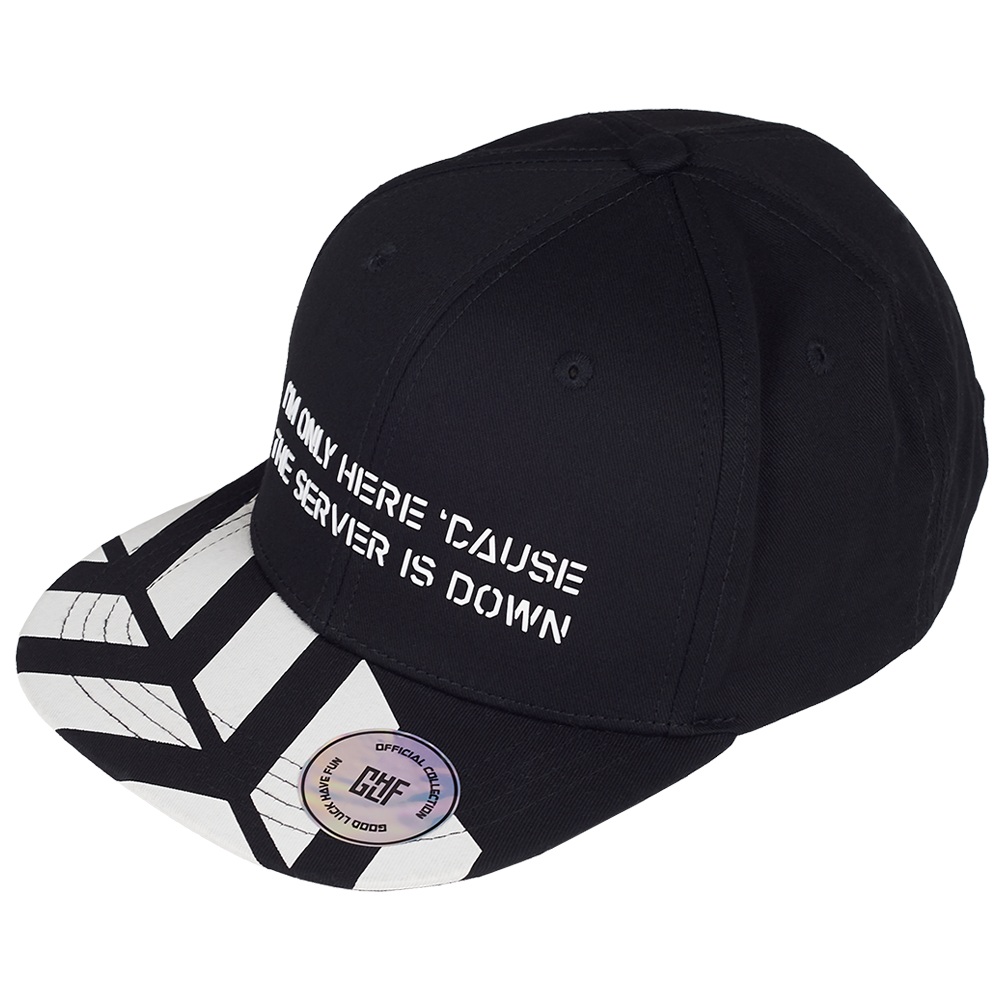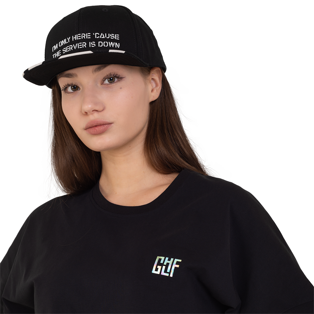 Кепка GLHF с прямым козырьком идеально продемонстрирует ваши увлечения и задаст стиль всему аутфиту. Надпись "I'M ONLY HERE 'CAUSE THE SERVER IS DOWN" переводится как "Я здесь только потому что сервер упал" будет понятна всем, кто проводит много времени в играх.