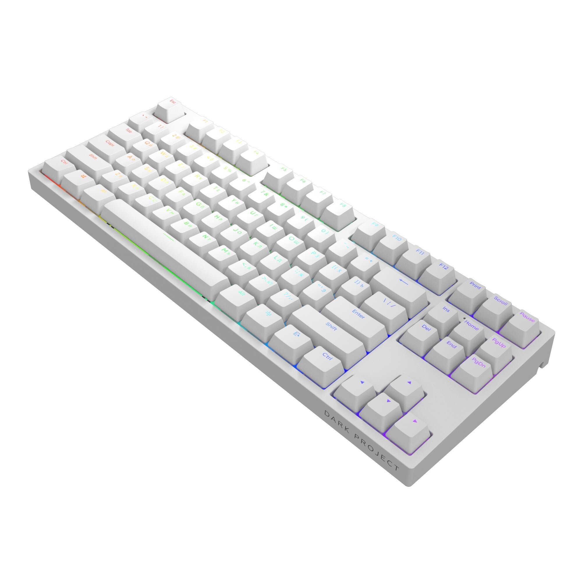 Dark Project KD87A — это компактная hot-swap TKL-клавиатура, выполненная из материалов высокого качества, с механическими свитчами Gateron Cap Teal, качественными кейкапами и динамичной настраиваемой RGB-подсветкой.