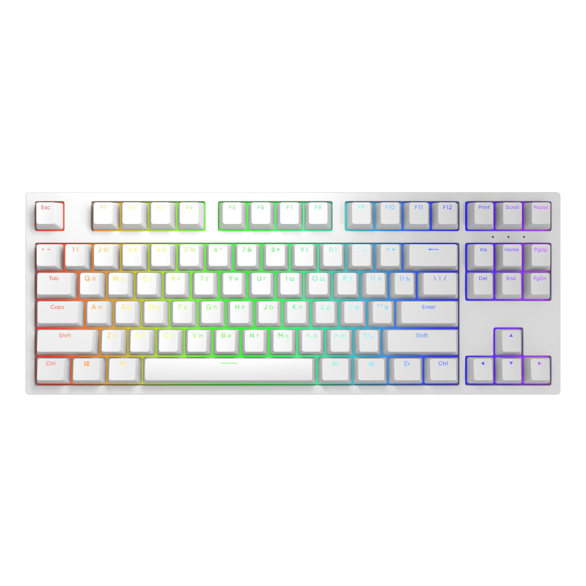PBT-кейкапы клавиатуры с профилем Cherry выполнены по технологии двойного литья и имеют как RU, так и ENG символы, расположенные сверху. Раскладка клавиш ANSI.