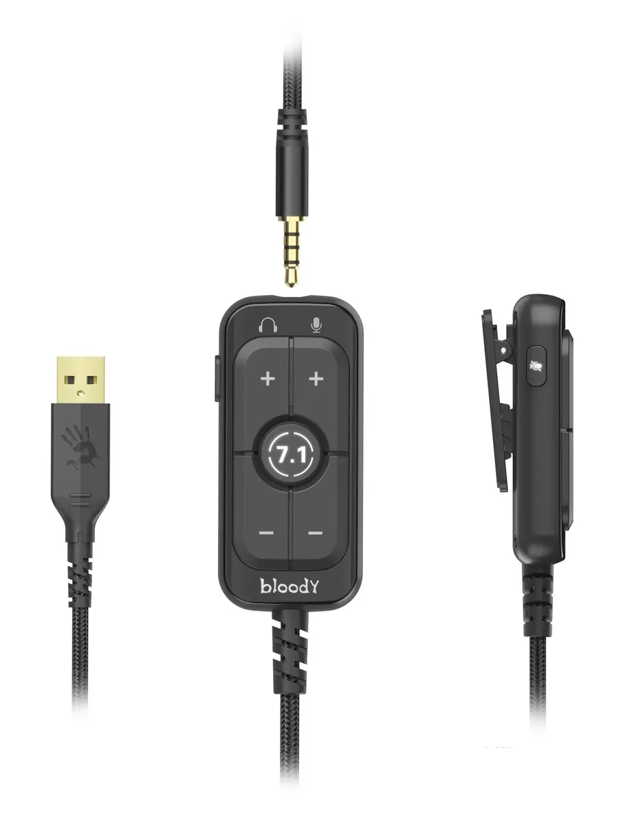 Данная гарнитура оборудована кабелем с разъёмом miniJack 3.5 мм, в комплекте также поставляется удлинитель со встроенной звуковой картой и пультом, который позволяет управлять как громкостью динамиков, так и микрофона.