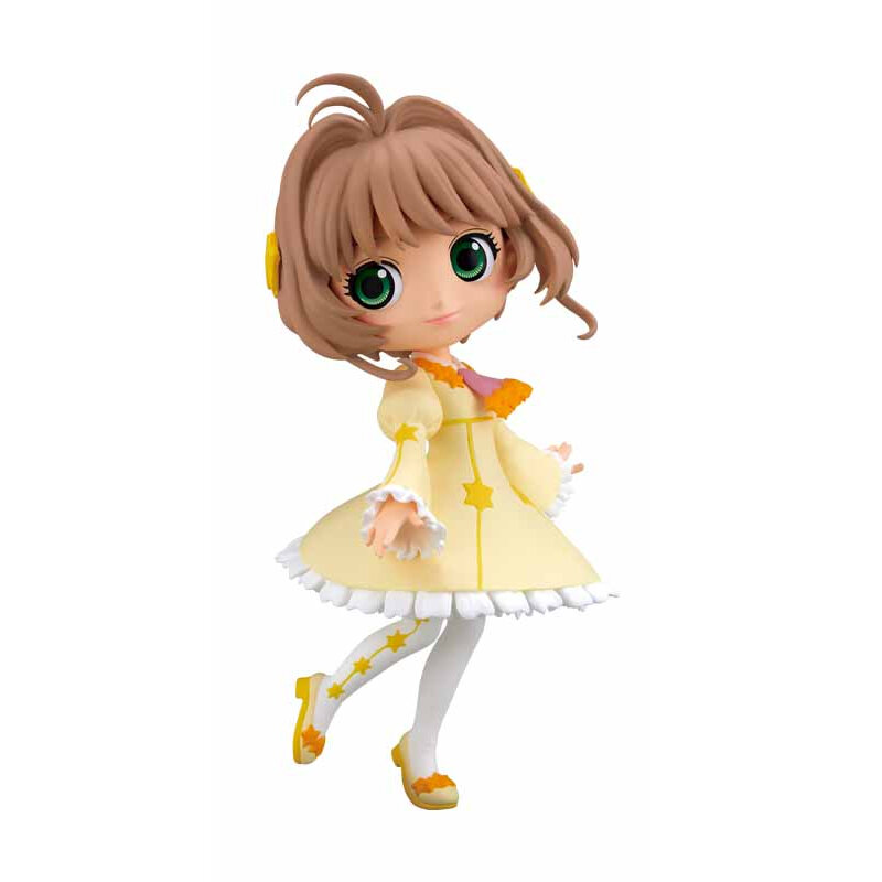 Фигурка Q Posket Cardcaptor Sakura Clear Card Sakura Kinomoto Vol.3 (Ver.A) выполнена в виде персонажа аниме и манги "Сакура — собирательница карт". Сакура Киномото - ученица 4-го класса школы Томоэда. Хорошо учится, не любит точных дисциплин, любит физкультуру, поскольку очень спортивная девочка и является капитаном группы поддержки. Весёлая, жизнерадостная и общительная, она хорошо ладит с одноклассниками, ответственно исполняет свои обязанности. Очень доверчива и не всегда сообразительна, из-за влияния своего старшего брата Тои очень боится привидений. Обладает магической силой — видеть будущее в сновидениях. Её жизнь кардинально меняется после того, как она находит волшебную книгу и знакомится с хранителем книги Кероберосом, называющего Сакуру «ловцом карт» и обязавшего её поймать и запечатать все карты Клоу. Именно из-за карт Сакура знакомится с Сяораном Ли и Мэйлин Ли, ставшими её соперниками за право владеть картами, но одновременно помогающими Киномото запечатывать карты. Сакуре очень нравится Юкито, друг Тои.