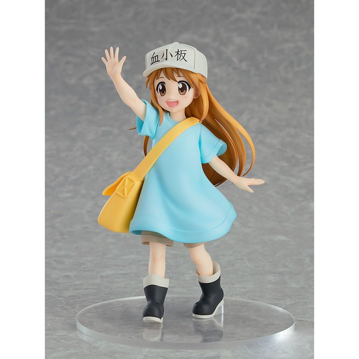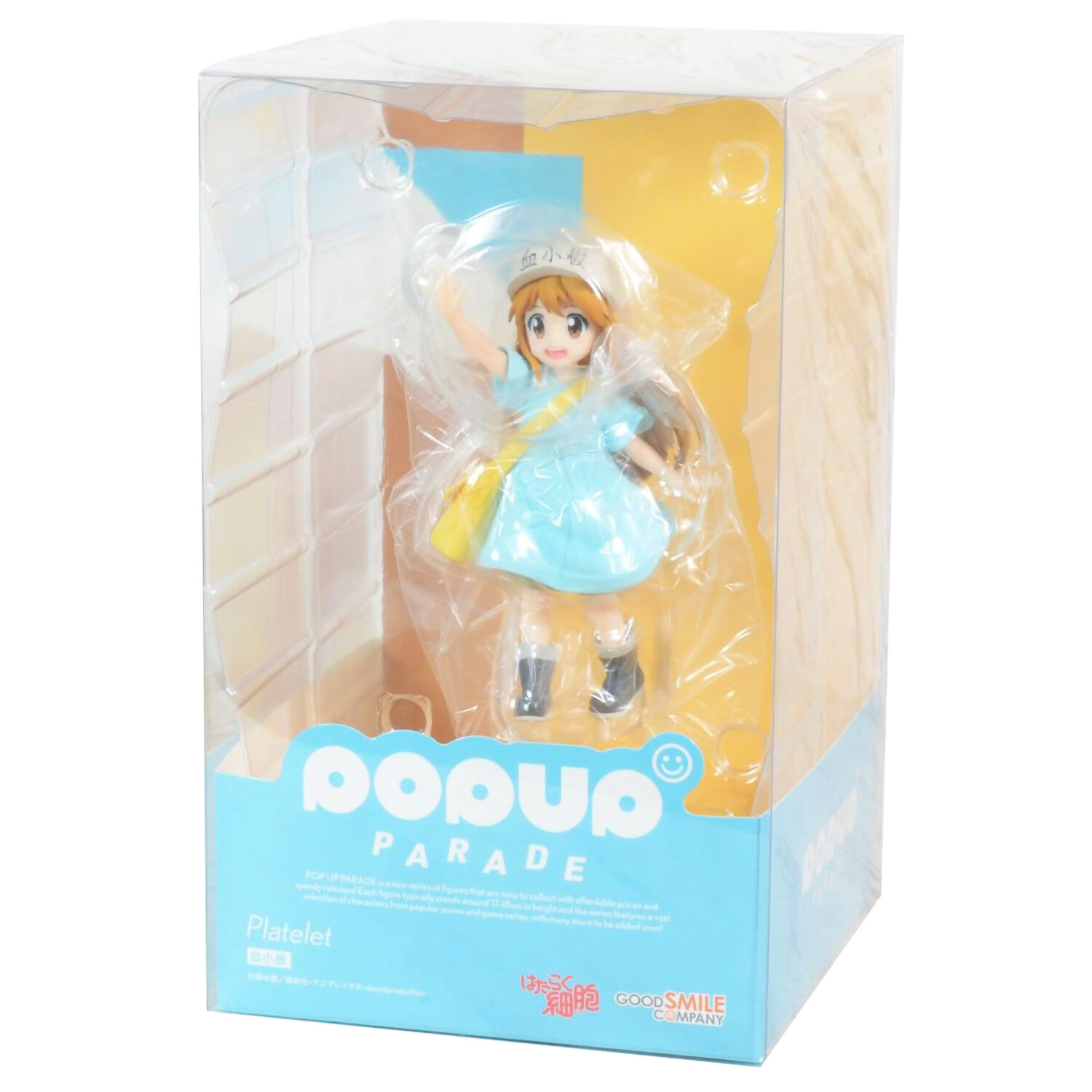 Фигурка из серии POP UP PARADE выполнена по мотивам аниме "Клетки за работой" и изображает Тромбоцит. Тромбоцит - второстепенный персонаж в клетках за работой!образован мегакариоцитом в результате фрагментации. Из-за фактического размера клеток тромбоцитов - они изображены как дети. Маленькая клетка с карамельными светлыми волосами до талии и карими глазами. Она носит форму "Тромбоцитов", состоящую из светло-коричневой кепки, синей футболки большого размера со светло-коричневыми шортами под ней и черных ботинок с белым мехом, и ее всегда можно увидеть работающей со своими коллегами. Форма напоминает реальных учеников японского детского сада.