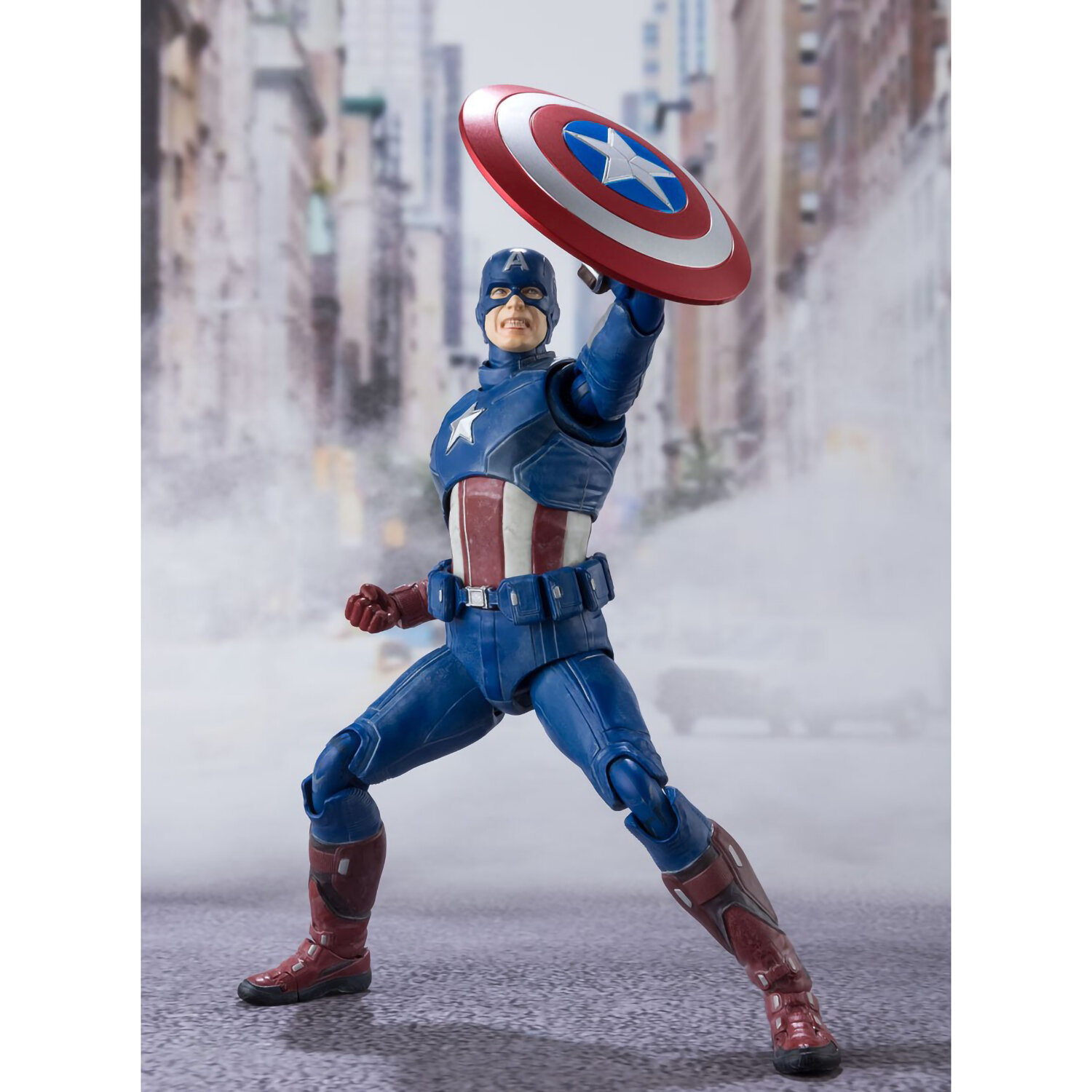 Кэп вернулся в обветренном и потрепанном в боях наряде. Указующий перст, решительное лицо в маске и щит с боевыми шрамами позволят вам воссоздать драматические моменты из фильма.