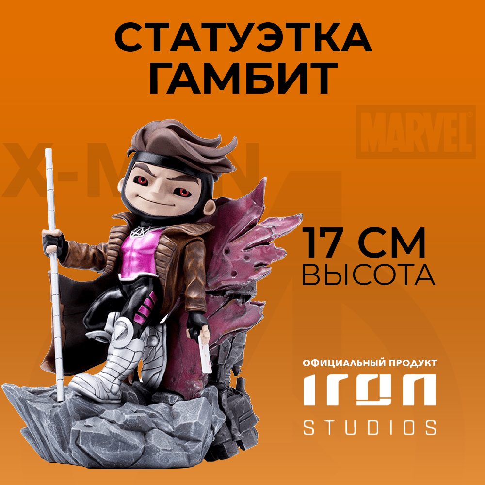 Статуэтка Gambit X-Men MiniCo изображает харизматичного каджунского мутанта, опирающегося на металлические останки Стража, с его неразлучным посохом в руке и с игральной картой Туз червей. Находясь, кажется, в расслабленном настроении после хорошей драки, он флиртует с Шельмой. Завербованный героиней Шторм в ряды Людей Икс, Гамбит - это Реми ЛеБо, очень сильный мутант, который может манипулировать кинетической энергией. Он также владеет искусством метания карт, борьбы и использования своего посоха, а также является опытным игроком в покер.