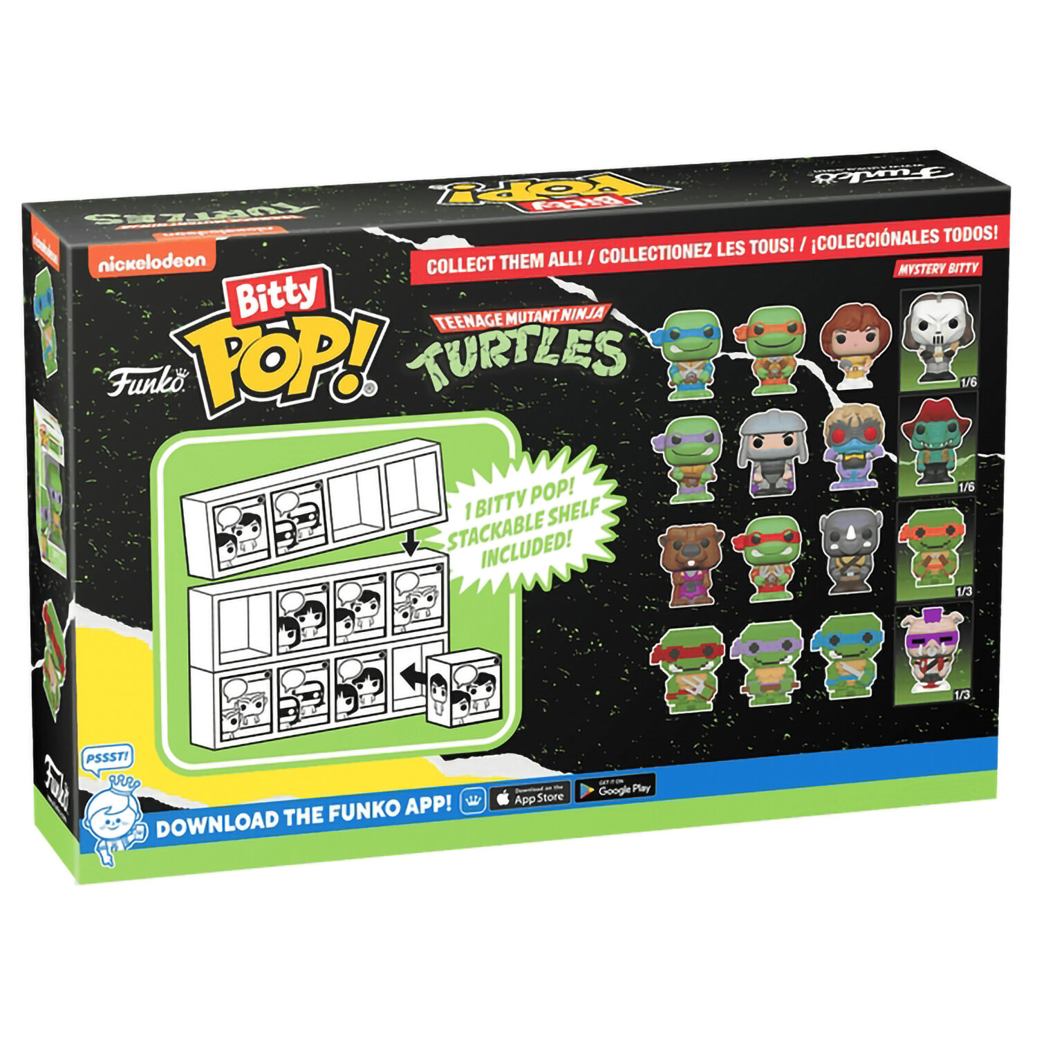 Bitty Pop! упакованы в твердые акриловые футляры со съемными нижними крышками. Съемные нижние крышки служат одновременно акриловой основой, к которой приклеены фигурки. Сортируйте и раскладывайте свои Bitty Pop! с помощью прилагаемой витрины. Акриловые витрины можно складывать в штабель и вмещать по четыре фигурки Bitty Pop! в каждый ряд.