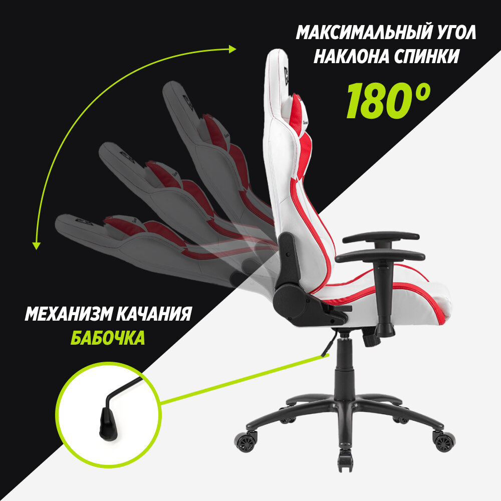 Спинка кресла должна плотно прилегать к спине и оказывать пользователю постоянную поддержку. Поэтому большую часть времени спинка будет находится в вертикальном положении или положении близком к нему. Угол наклона спинки кресла можно изменить, чтобы занять удобное положение, например, во время просмотра видео, а также в других случаях на усмотрение пользователя. Это важное и полезное свойство кресел, которым следует пользоваться разумно, не в ущерб здоровью. Угол наклона геймерских кресел GLHF 2X составляет 180 градусов, с возможностью фиксации положения спинки кресла под любым углом. GLHF 2X не заменит кровать, но позволит расслабится в те моменты, когда это нужно.