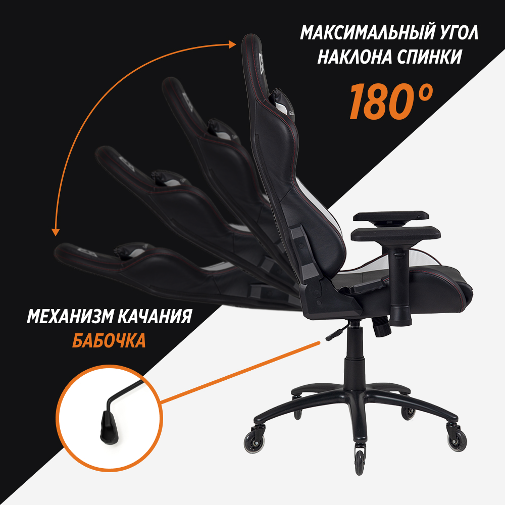 Спинка кресла должна плотно прилегать к спине и оказывать пользователю постоянную поддержку. Поэтому большую часть времени спинка будет находится в вертикальном положении или положении близком к нему. Угол наклона спинки кресла можно изменить, чтобы занять удобное положение, например, во время просмотра видео, а также в других случаях на усмотрение пользователя. Это важное и полезное свойство кресел, которым следует пользоваться разумно, не в ущерб здоровью. Угол наклона геймерских кресел GLHF 5X составляет 180 градусов, с возможностью фиксации положения спинки кресла под любым углом. GLHF 5X не заменит кровать, но позволит расслабится в те моменты, когда это нужно.