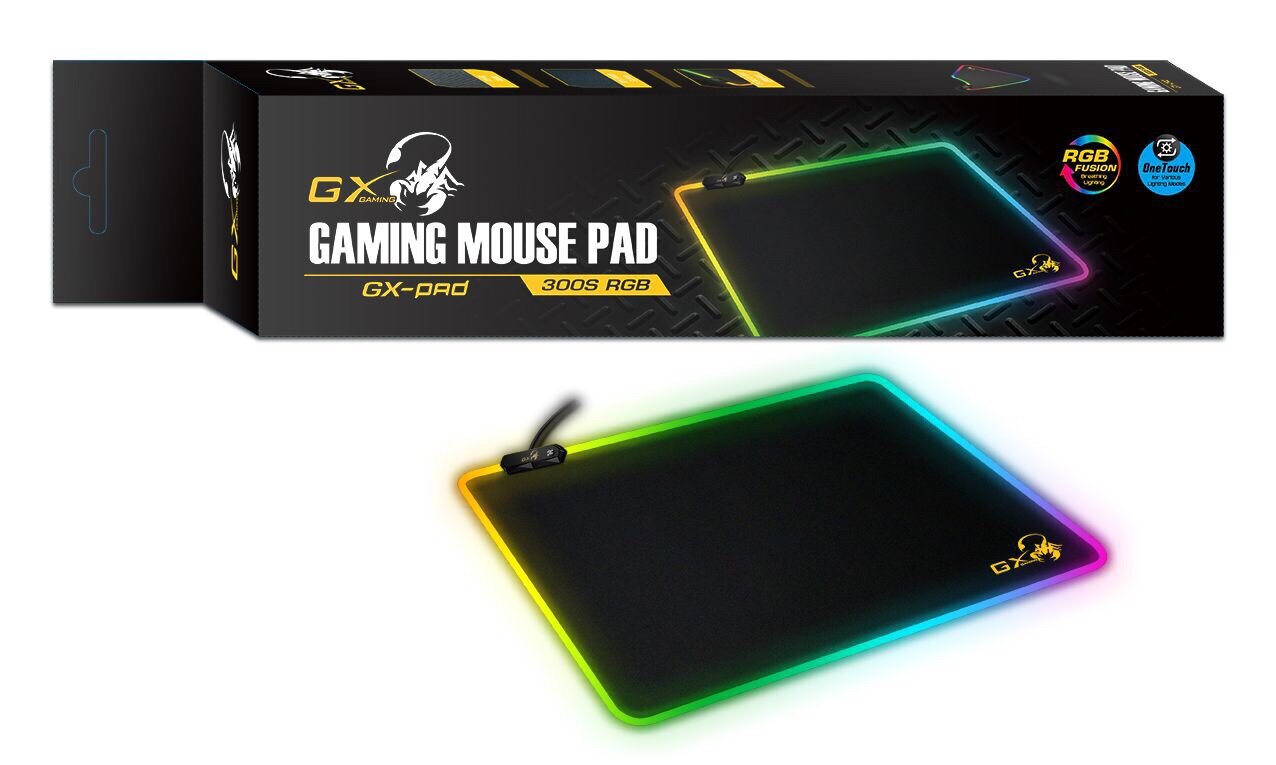 Игровой коврик Genius GX-Pad 300S RGB с 10 режимами RGB-подсветки, противоскользящим резиновым покрытием, гладкой поверхностью и micro-USB кабелем питания в оплетке.