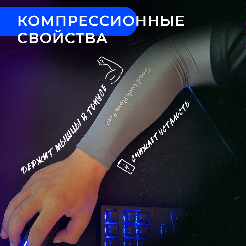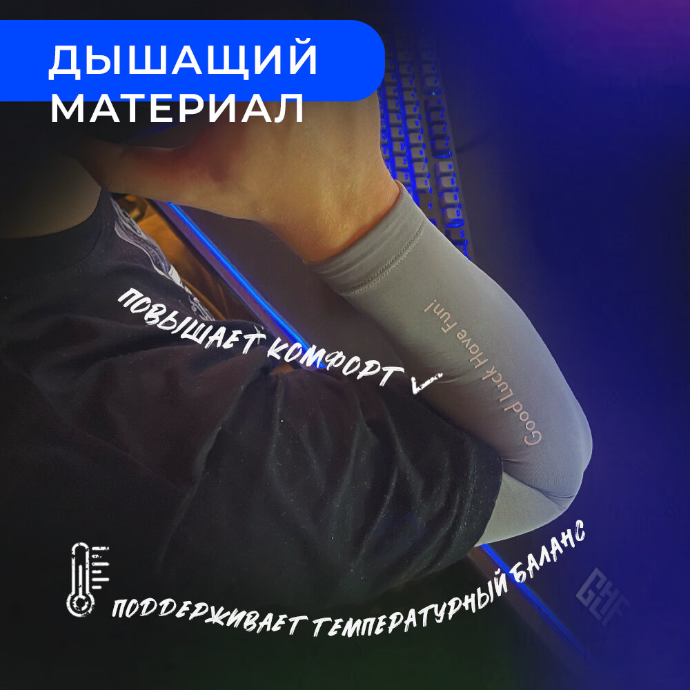 Дизайнв сером цвете с логотипом GLHF создает превосходный стиль и правильный настрой на победу в сражении. Рукав обеспечивает поддержку мышц для точности прицеливания в вашей любимой игре, а также во время интенсивных занятий спортом. Эластичный и влагоотводящий материал сохранит температурный баланс и обеспечит комфорт вашей руки.