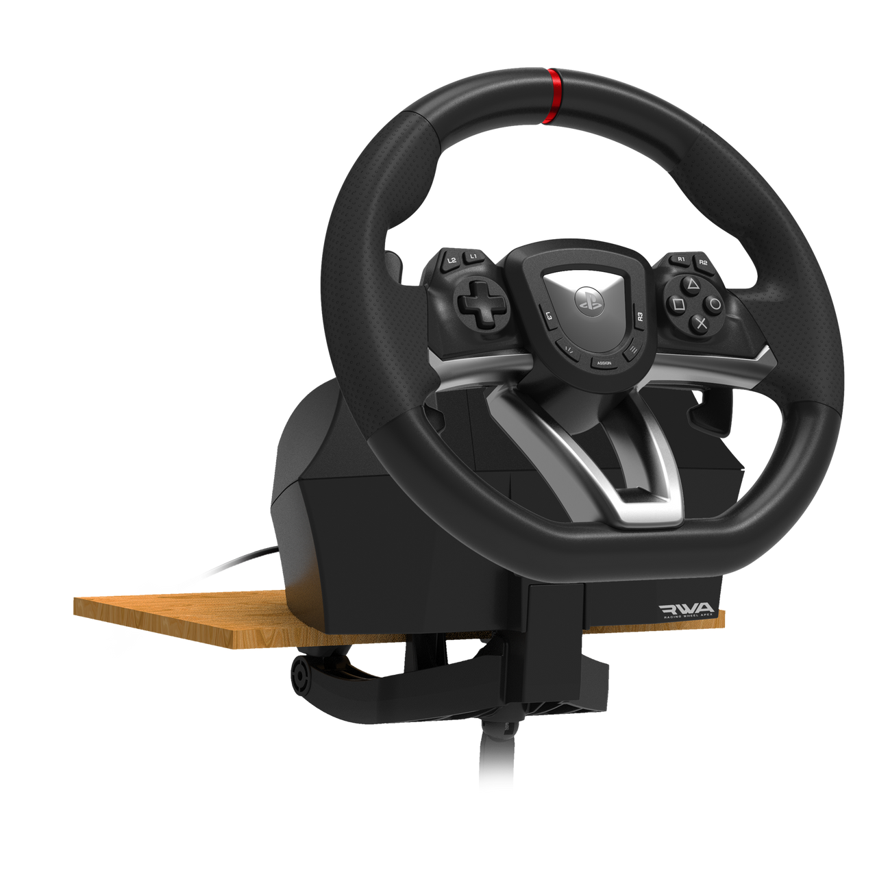 Беспроводной гоночный руль APEX надежно крепится к столу или подставке для гоночных рулей с помощью прочных зажимов и стальных деталей. Полноразмерные педали рассчитаны на длительный срок службы.