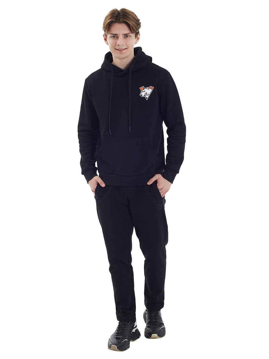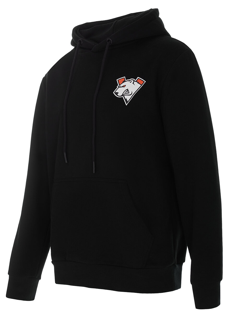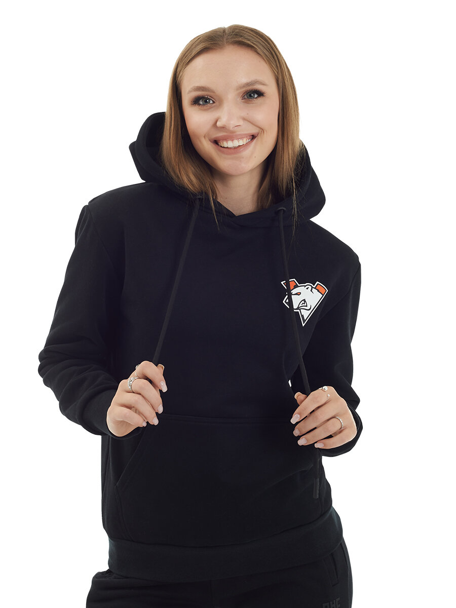 Худи свободного прямого кроя со спущенной линией плеча, уютным капюшоном и вместительным карманом - идеальное решение в прохладный день. Худи выполнено из смесовой ткани высочайшего качества. На кармане-кенгуру расположен логотип кибеспортивной команды, шнур капюшона также украшен принтом лого.