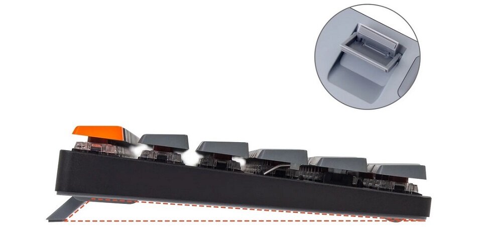 Самая низкая часть в высоту K5SE всего 17 мм вместе с высотой свитчей и кейкапов. Угол наклона клавиатуры можно регулировать с помощью двухступенчатых ножек с нескользящей резиновой прокладкой.