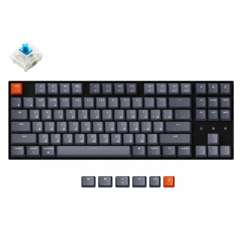 Keychron K8 - это компактная беспроводная клавиатура без нум-пада и с поддержкой горячей замены свитчей. Небольшие размеры клавиатуры позволяют использовать её как дома, так и в поездке. В комплекте с Keychron K8 идут сменные кейкапы для Win и MacOS.