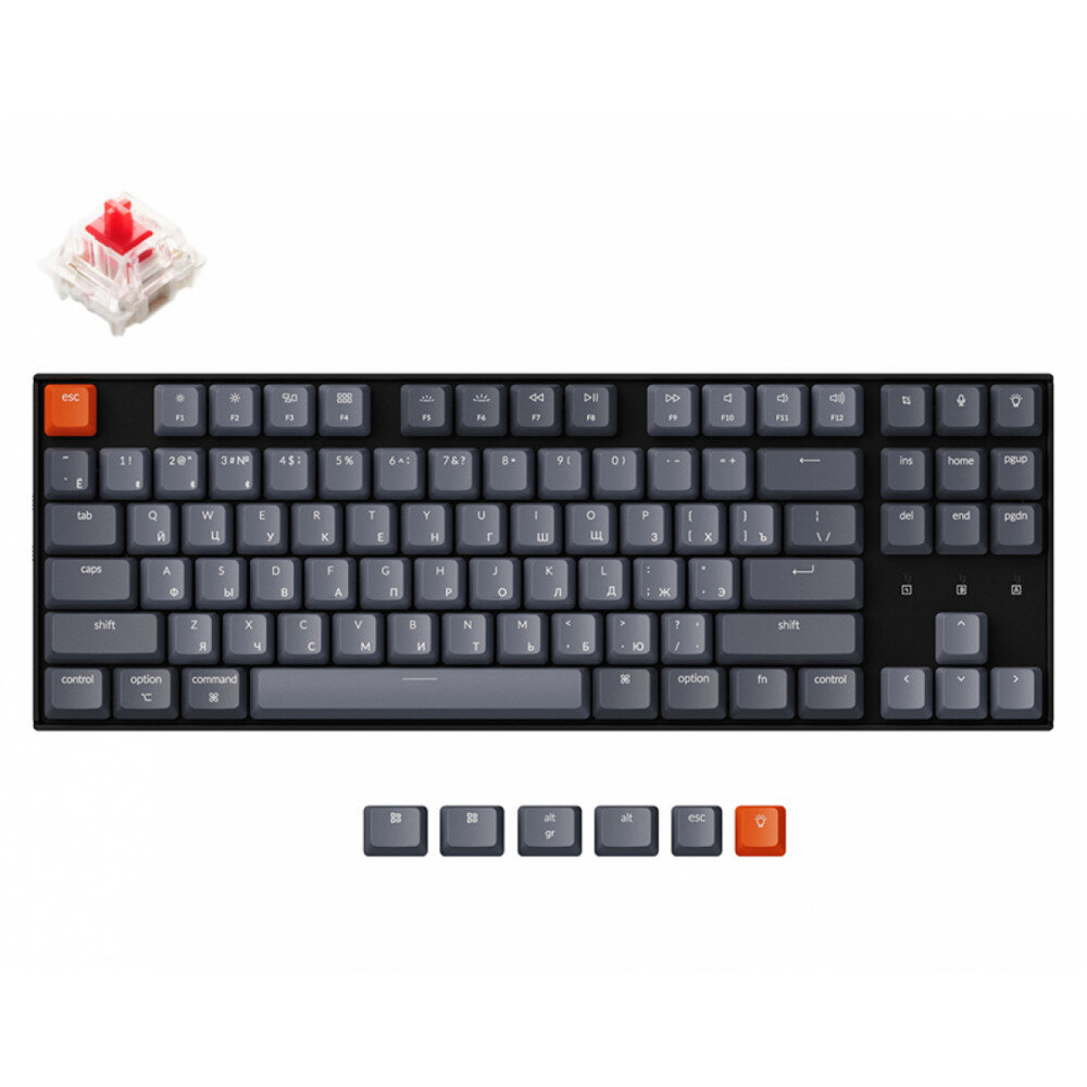 Keychron K8 - это компактная беспроводная клавиатура без нум-пада и с поддержкой горячей замены свитчей. Небольшие размеры клавиатуры позволяют использовать её как дома, так и в поездке. В комплекте с Keychron K8 идут сменные кейкапы для Win и MacOS.