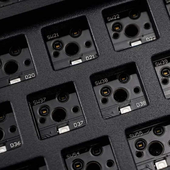 Плата клавиатуры оборудована гнёздами с возможностью горячей замены, которые поддерживают как 3 pin, так и 5 pin механические переключатели MX (включая Cherry, Gateron, Kailh, Panda и т.д.), поэтому вы легко можете установить любые свитчи без пайки.