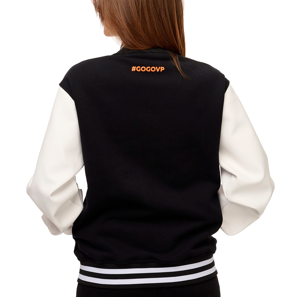 Чёрный корпус в сочетании с контрастными белыми рукавами придаёт куртке эстетику классического университетского стиля. Бомбер рассчитан на комфортную посадку — подойдёт как для прохладной погоды, так и в качестве выразительного элемента образа.
