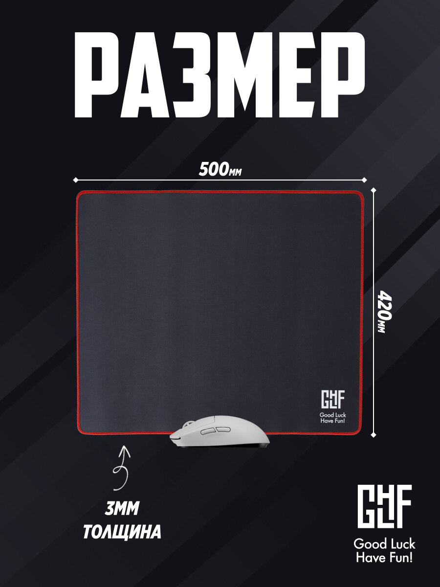 GLHF Black изготавливается в двух наиболее востребованных геймерами размерах: L (500 mm x 420 mm х 3 mm) и XL (900 mm x 420 mm x 3 mm), таким образом каждый пользователь сможет подобрать для себя наиболее оптимальный вариант.