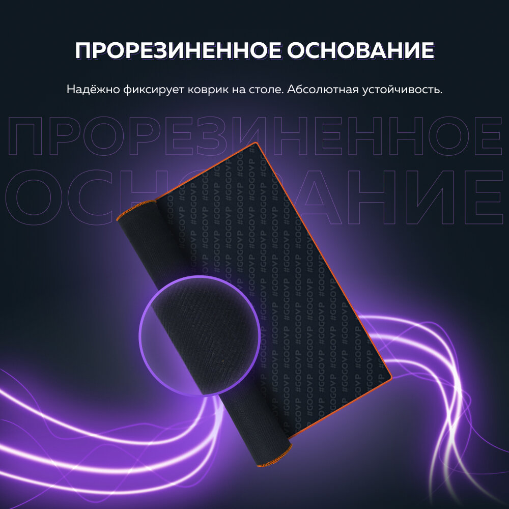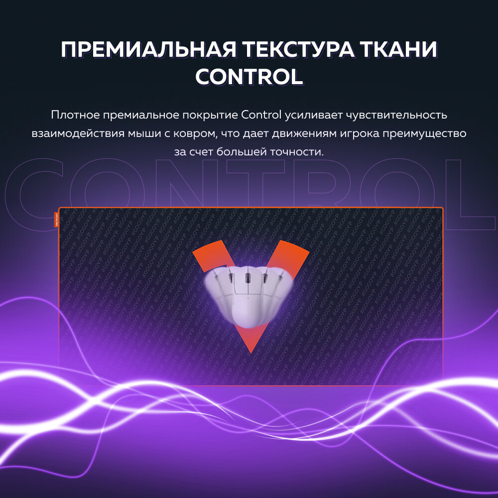 Покрытие коврика выполнено из плотной премиальной ткани Control, которая усиливает чувствительность взаимодействия игровой мыши с поверхностью, что дает движениям игрока преимущество за счет большей скорости и точности.