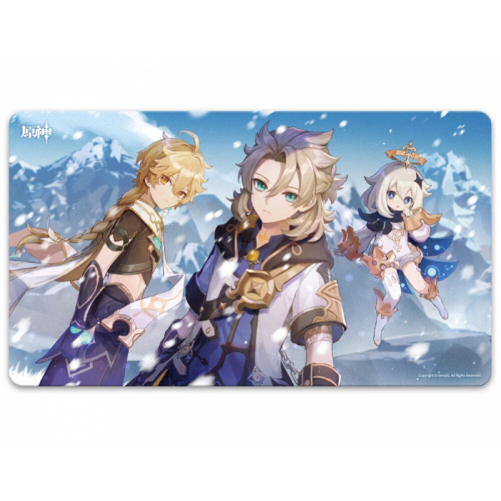 Это игровой коврик с тремя персонажами из культовой игры Genshin Impact. Персонажи изображены на фоне заснеженных гор и снегопада. Коврик с яркой картинкой не оставит равнодушным ни одного поклонника данной игры. А стойкая к истиранию поверхность позволит использовать его очень долгое время.