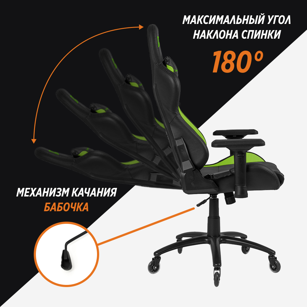 Спинка кресла должна плотно прилегать к спине и оказывать пользователю постоянную поддержку. Поэтому большую часть времени спинка будет находится в вертикальном положении или положении близком к нему. Угол наклона спинки кресла можно изменить, чтобы занять удобное положение, например, во время просмотра видео, а также в других случаях на усмотрение пользователя. Это важное и полезное свойство кресел, которым следует пользоваться разумно, не в ущерб здоровью. Угол наклона геймерских кресел GLHF 5X составляет 180 градусов, с возможностью фиксации положения спинки кресла под любым углом. GLHF 5X не заменит кровать, но позволит расслабится в те моменты, когда это нужно.