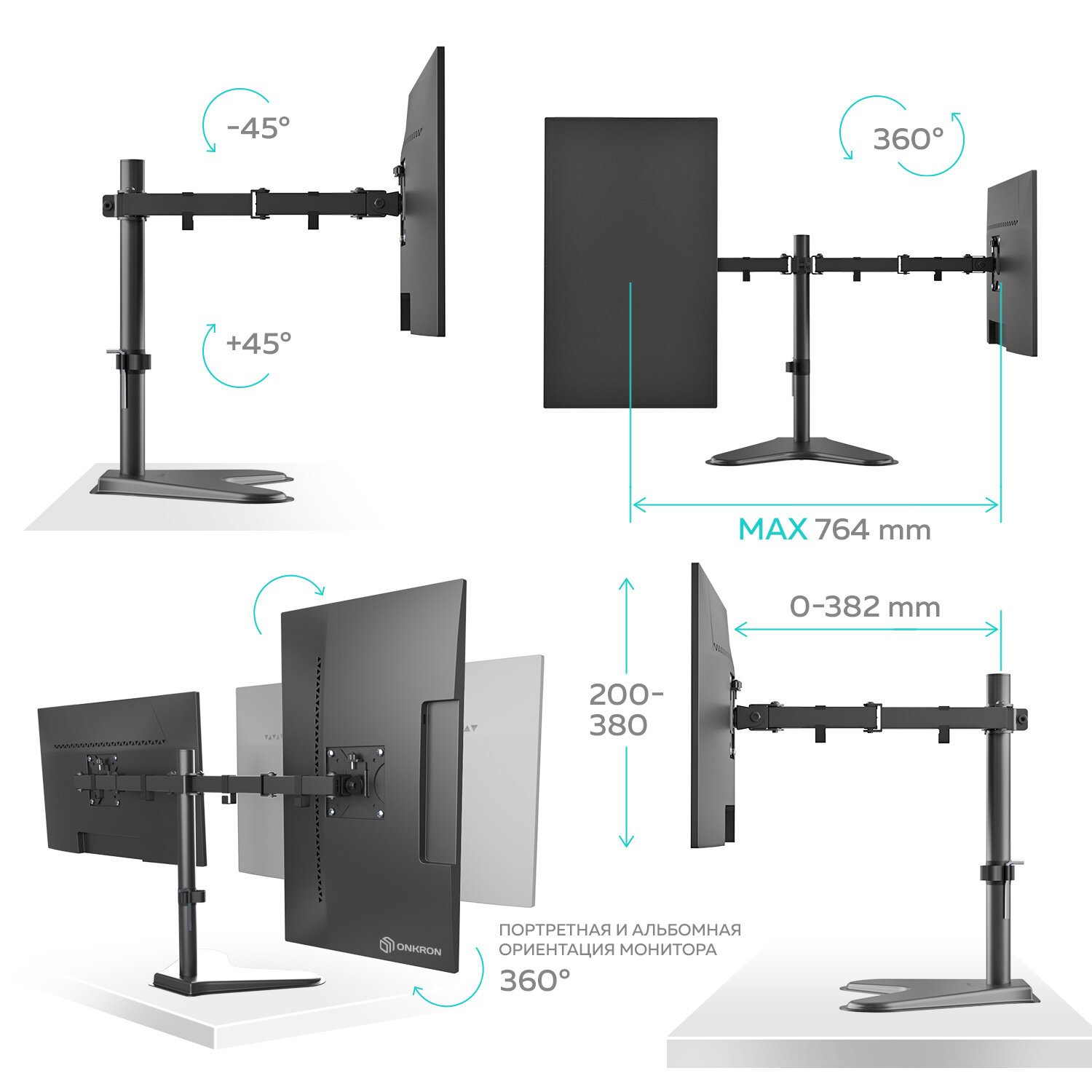 Модель ONKRON D221FS позволяет расположить экраны горизонтально и в случае необходимости повернуть на угол до 360°.