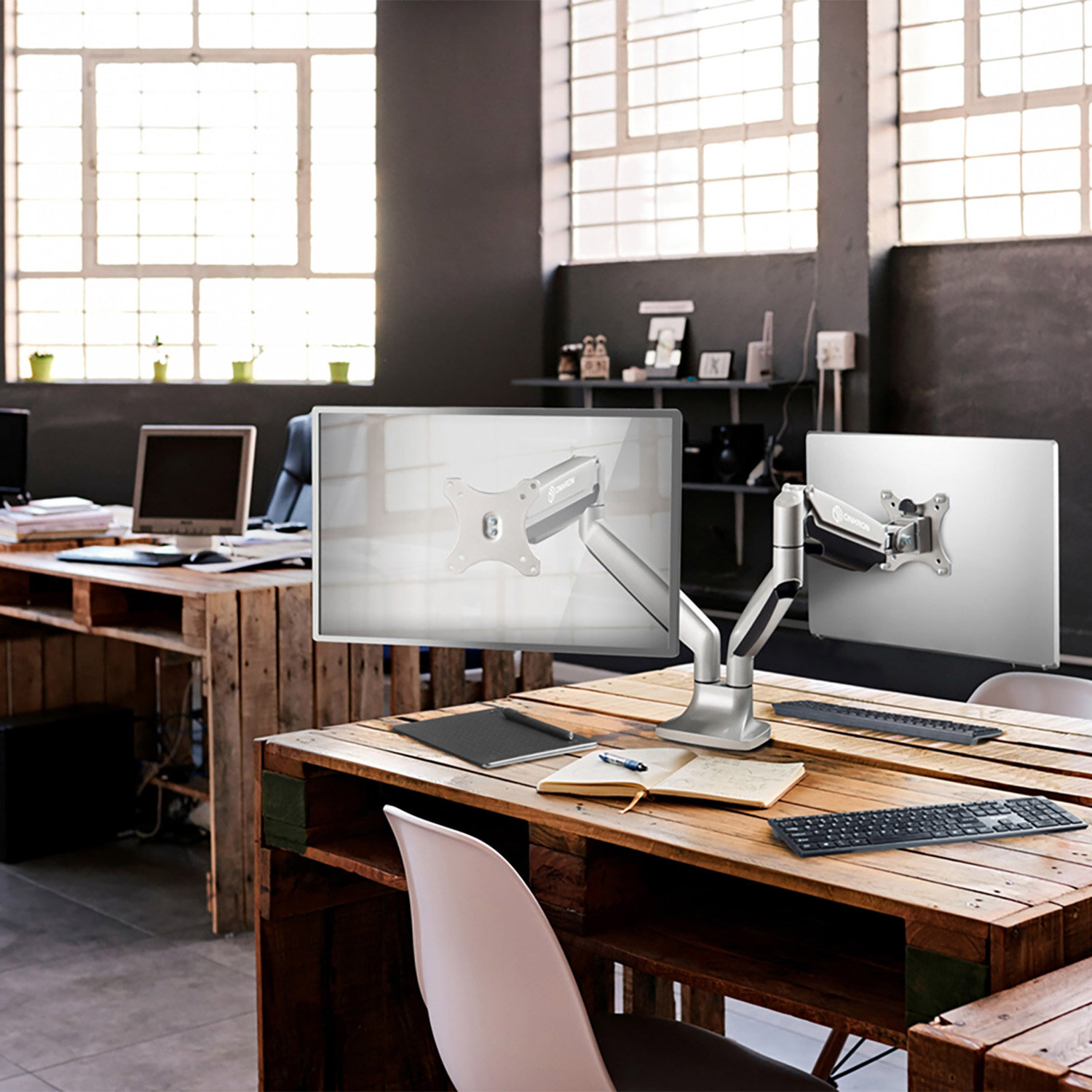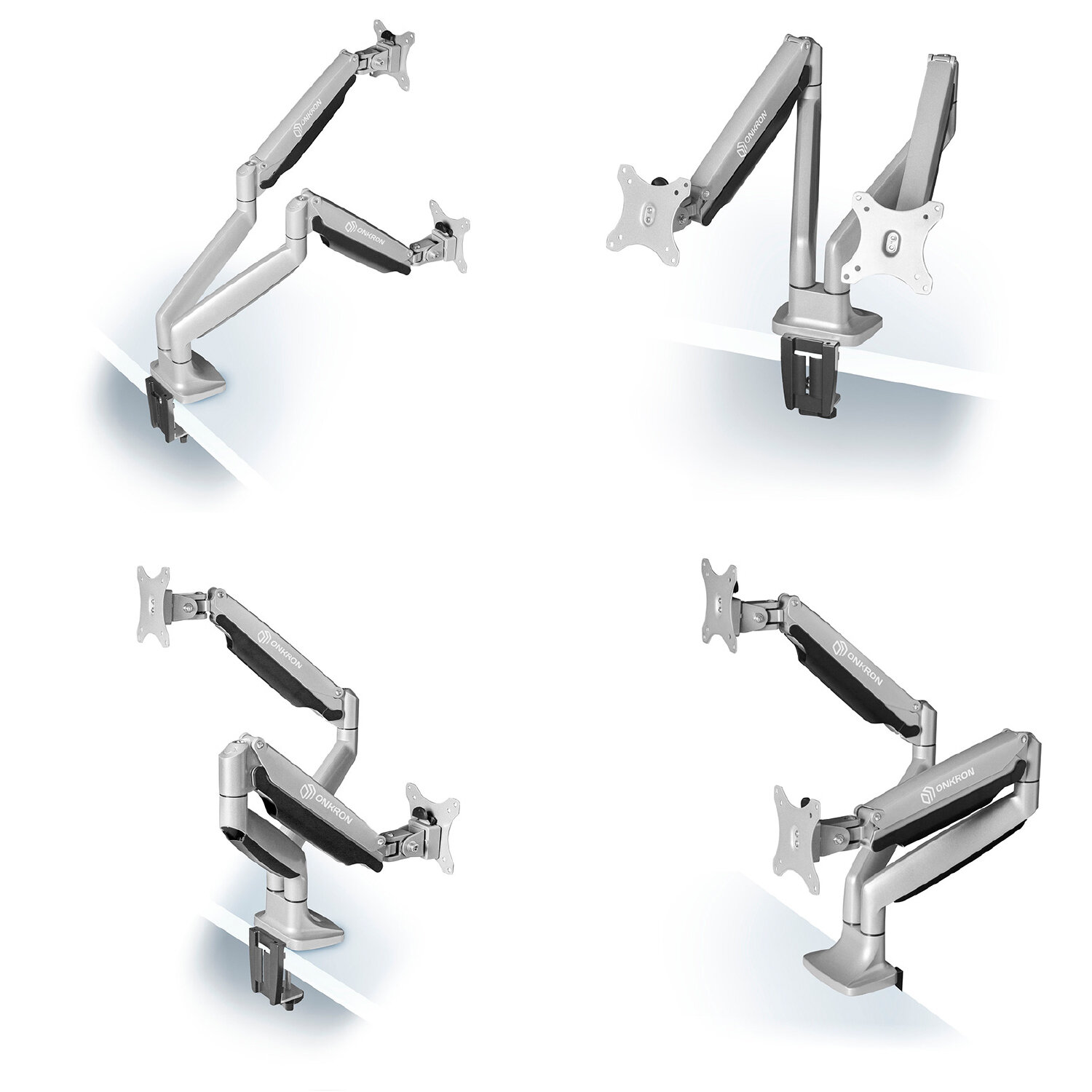 Настольный кронштейн ONKRON G200 подойдёт для двух мониторов диагональю от 13 до 32 дюймов (33,02 – 81,28 см) и весом до 9 кг каждый. С ним легко будет выбрать самое удобное положение для монитора, ведь его конструкция позволяет выбрать максимально удобную позицию для каждого монитора и поддерживает портретную и альбомную ориентацию установки. Крепление выполнено из стали, что обеспечивает максимальную прочность и долговечность.