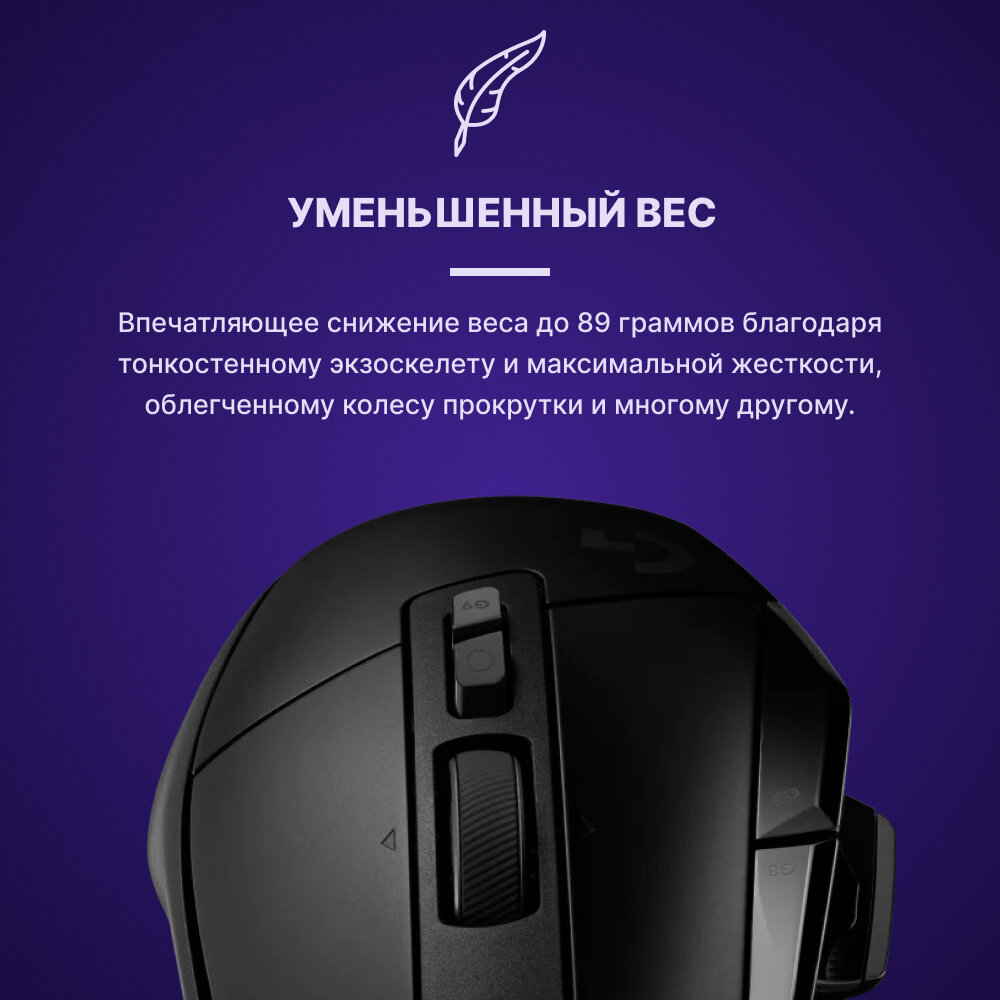 Классический дизайн G502 сочетается с впечатляющим снижением веса до 89 граммов благодаря тонкостенному экзоскелету из минимального количества материала и максимальной жесткости, облегченному колесу прокрутки и многим другим.