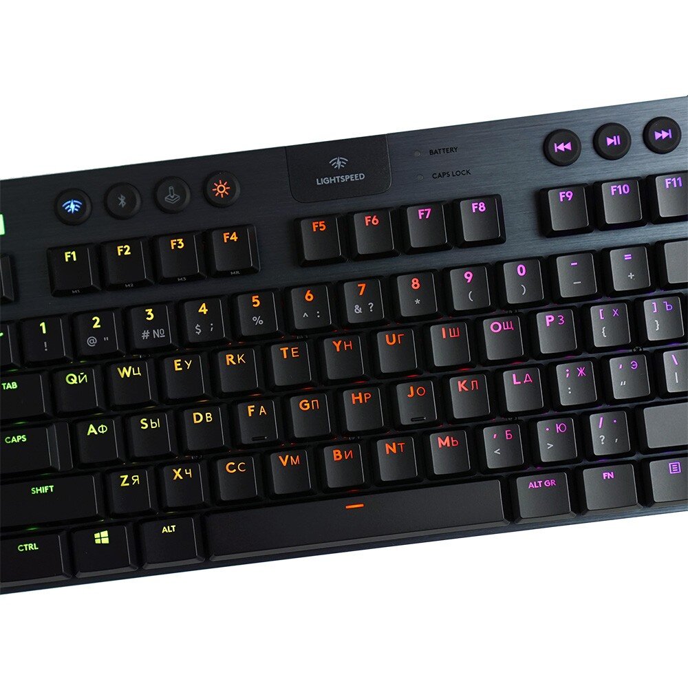 Игровая клавиатура Logitech G915 TKL LightSpeed GL Clicky включает в себя две технологии Lightspeed и Lightsync. Низкопрофильные игровые переключатели выполненные из пластика высокого качества, металлический корпус с матовым покрытием который создаст приятное ощущение от использования.