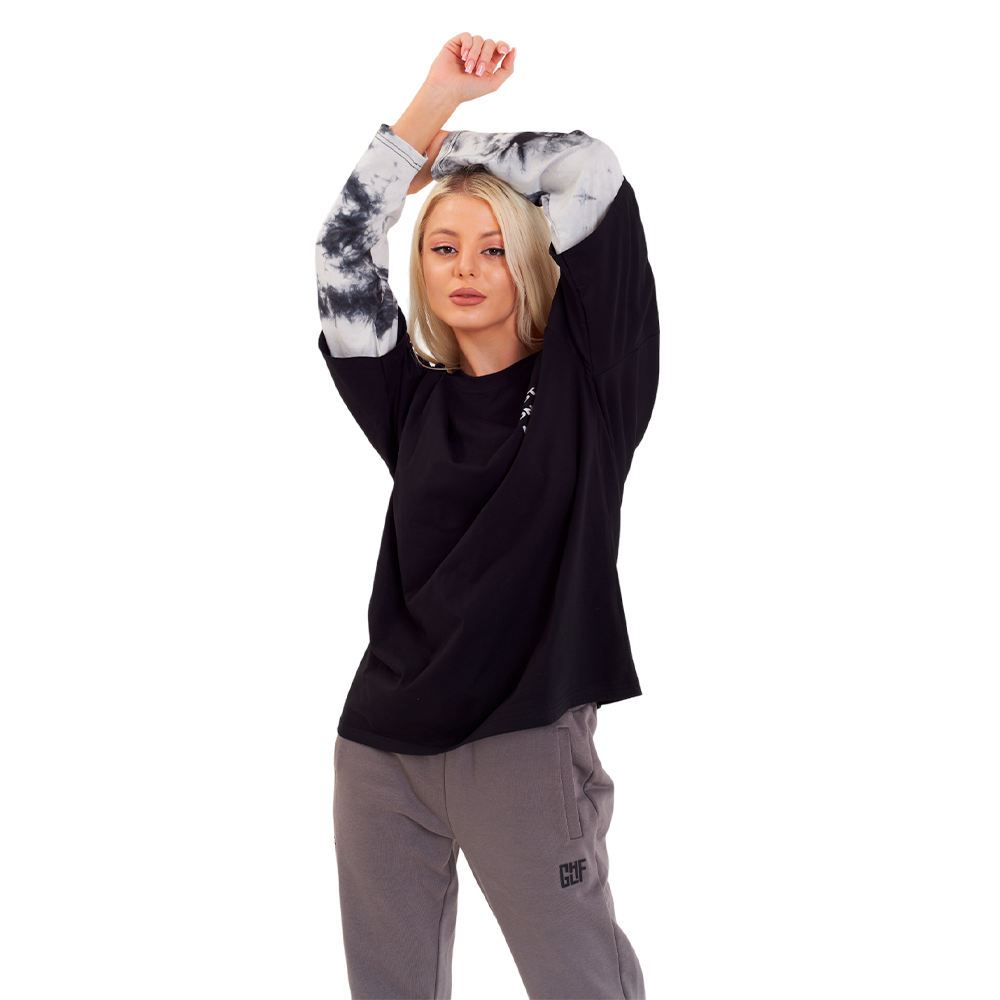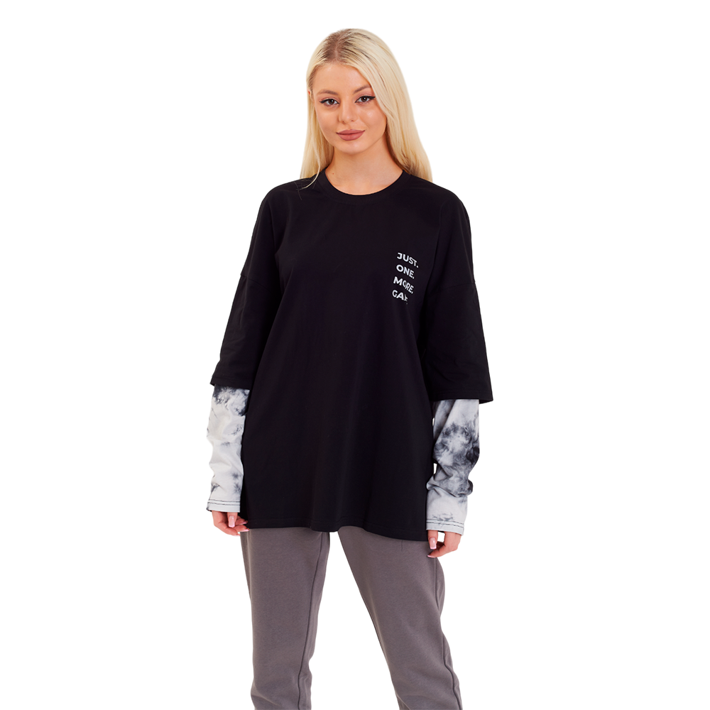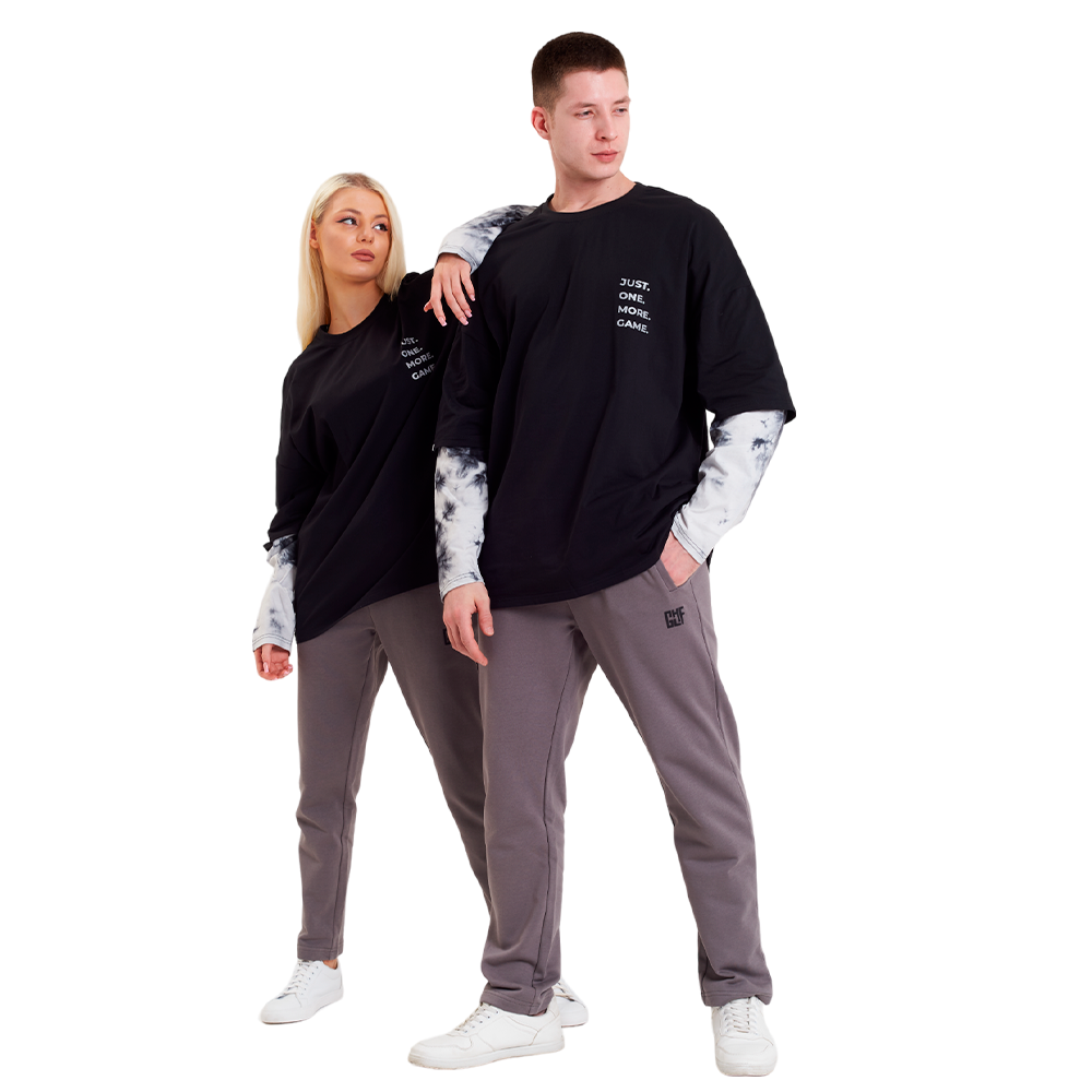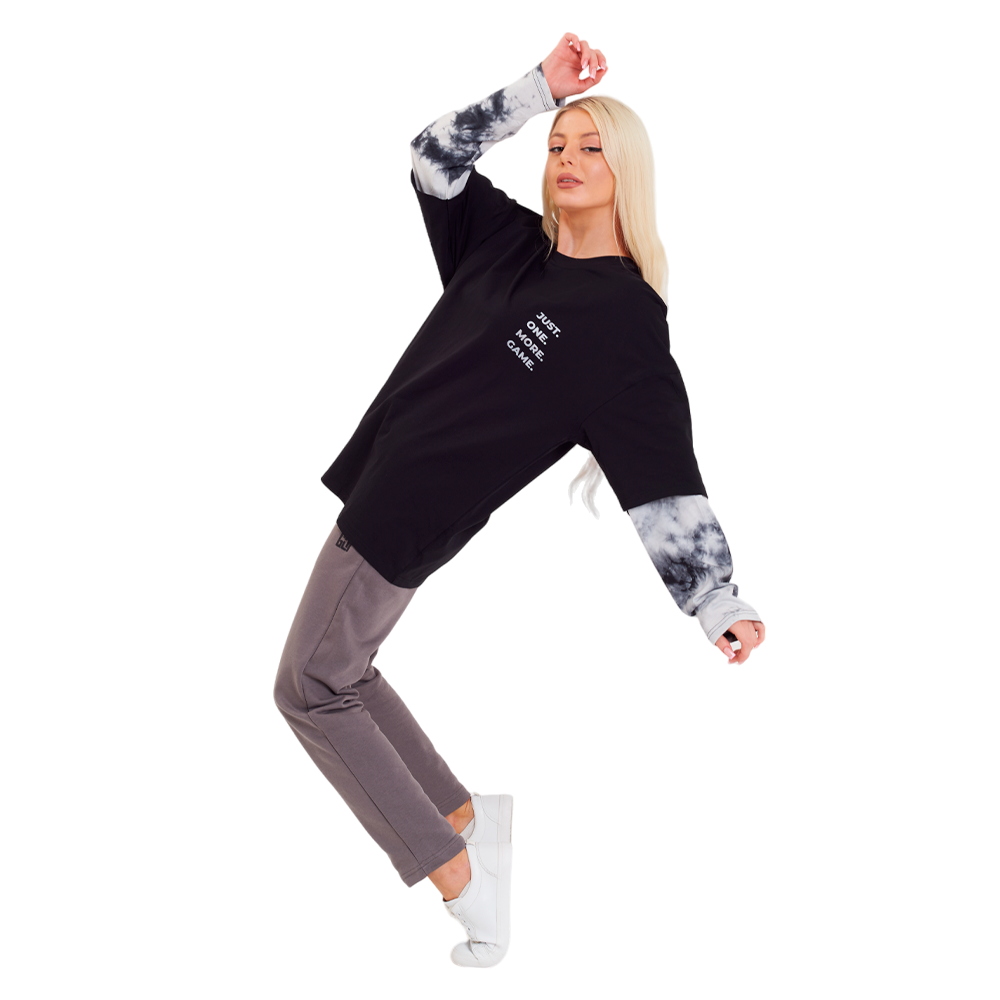 Лонгслив дополняет знакомая всем геймерам фраза "JUST ONE MORE GAME", выполненная с эффектом с светоотражения. Удлинённая часть рукавов имеет абстрактный чёрно-белый принт. Принт может отличаться от изображённого на фото, так как выполняется методом tie dye.