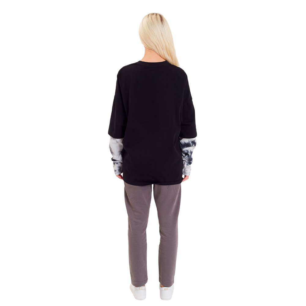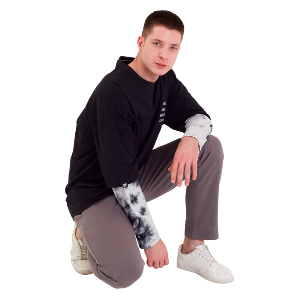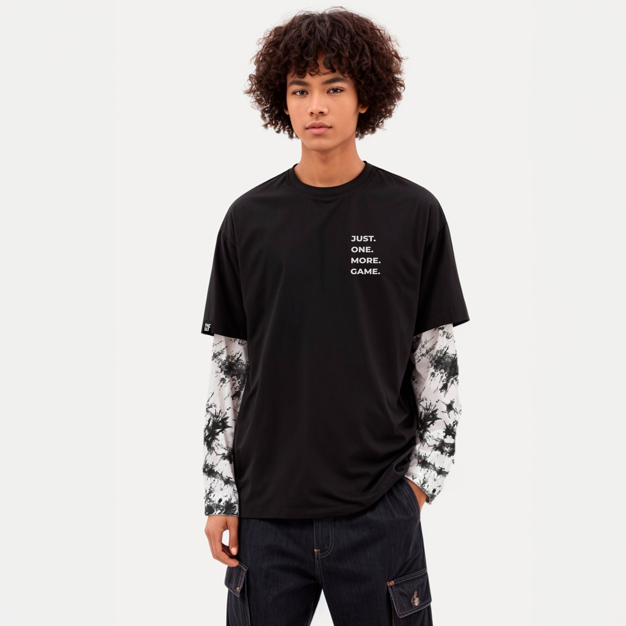 Лонгслив дополняет знакомая всем геймерам фраза "JUST ONE MORE GAME", выполненная с эффектом с светоотражения. Удлинённая часть рукавов имеет абстрактный чёрно-белый принт. Принт может отличаться от изображённого на фото, так как выполняется методом tie dye.