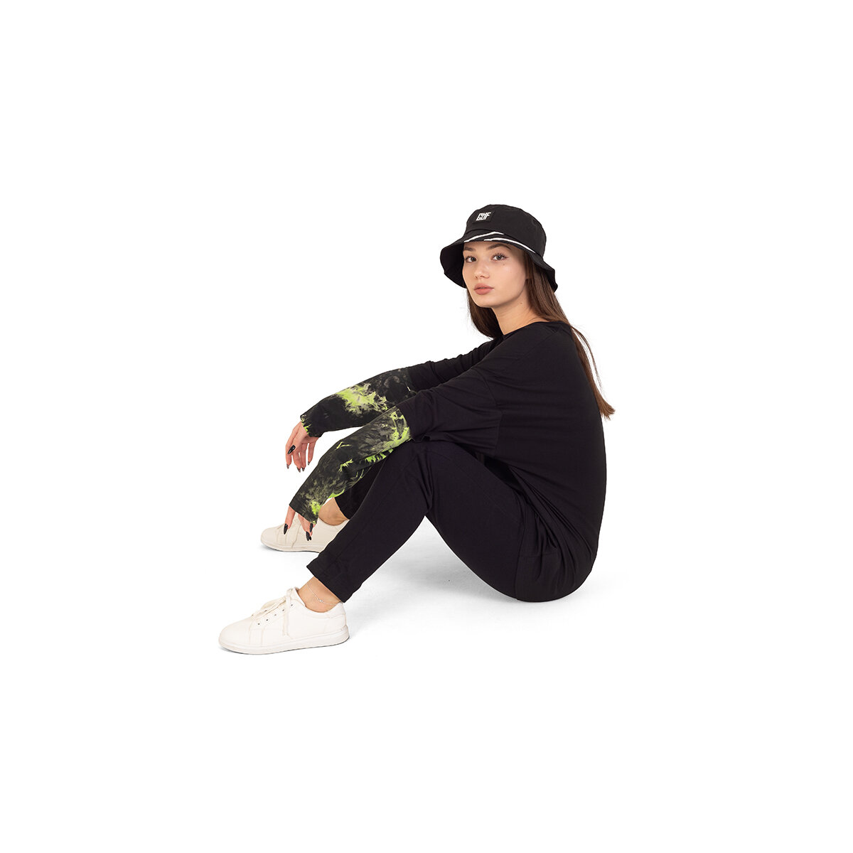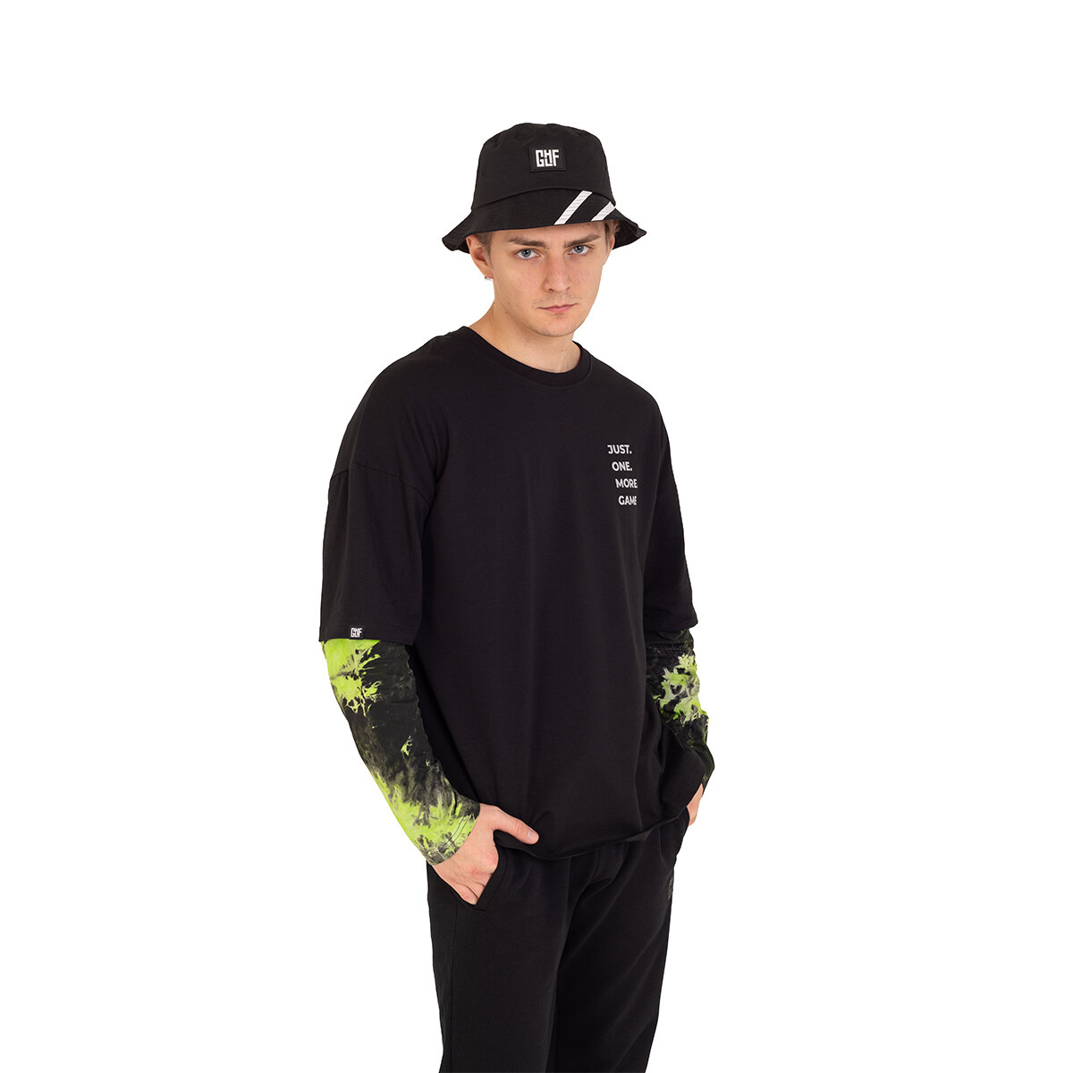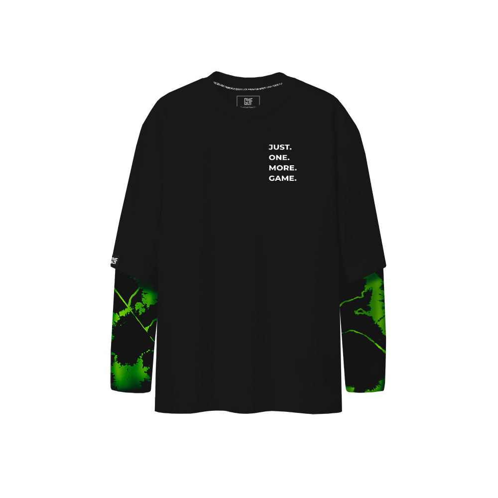Лонгслив дополняет знакомая всем геймерам фраза "JUST ONE MORE GAME", выполненная с эффектом с светоотражения. Удлинённая часть рукавов имеет абстрактный зелёный принт. Принт может отличаться от изображённого на фото, так как выполняется методом tie dye.