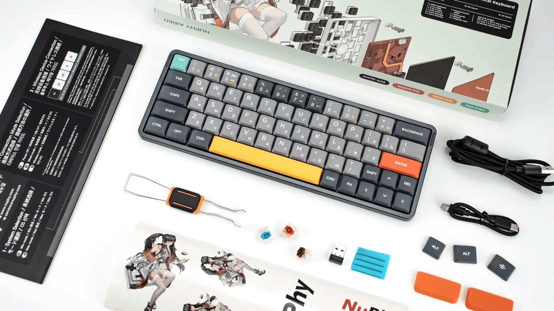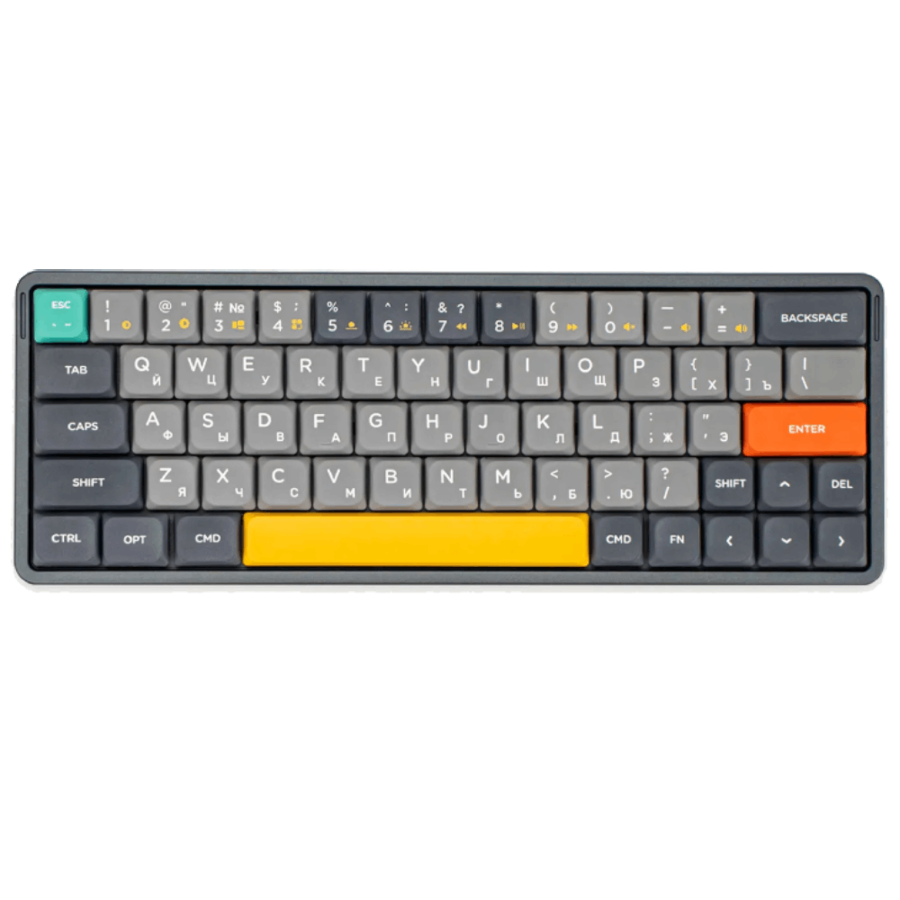 Nuphy Air60 - инновационная ультратонкая клавиатура с форматом 60%. Эта клавиатура идёт с комплекте с самыми тонкими в мире PBT сферическими кейкапами, беспроводным соединением на частоте 2.4Ггц с низкой задержкой, а также возможностью подключить по bluetooth, и функций горячей замены переключателей. Air60 сочетает в себе мощный функционал в небольшом корпусе и подойдёт для использования как со стационарным компьютером, так и с ноутбуком. Для этого в комплекте есть дополнительный кабель с разъёмом USB Type-C длиной 0.2м