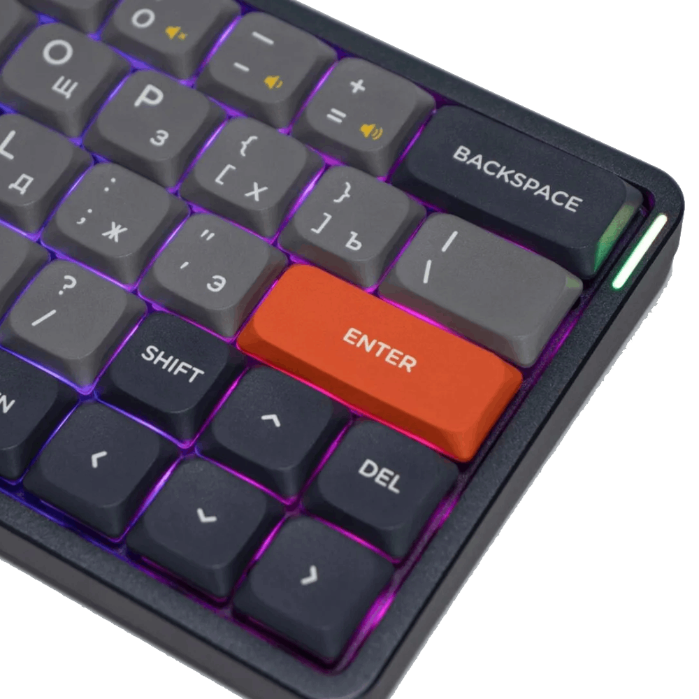 Кликающие механические переключатели Gateron Low-profile 2.0 Blue в Air60 с силой нажатия 65г и коротким ходом великолепно подойдут геймерам, а также всем любителям яркой тактильной отдачи и кликающего звука.