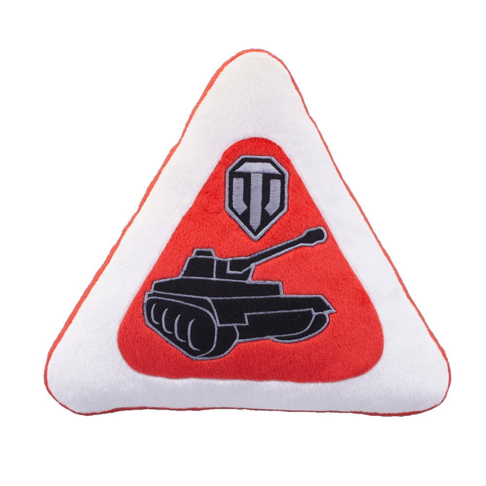 Декоративная подушка с логотипом игры «World of Tanks», в виде треугольника, бело-красного цвета. На лицевой стороне подушки на белом фоне изображен логотип игры «World of Tanks» в красной треугольной полосе.