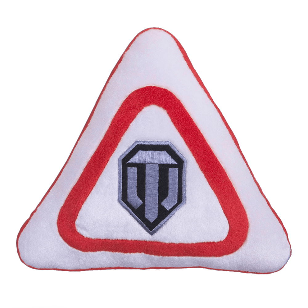 Декоративная подушка с логотипом игры «World of Tanks», в виде треугольника, бело-красного цвета. На лицевой стороне подушки на белом фоне изображен логотип игры «World of Tanks» в красной треугольной полосе.