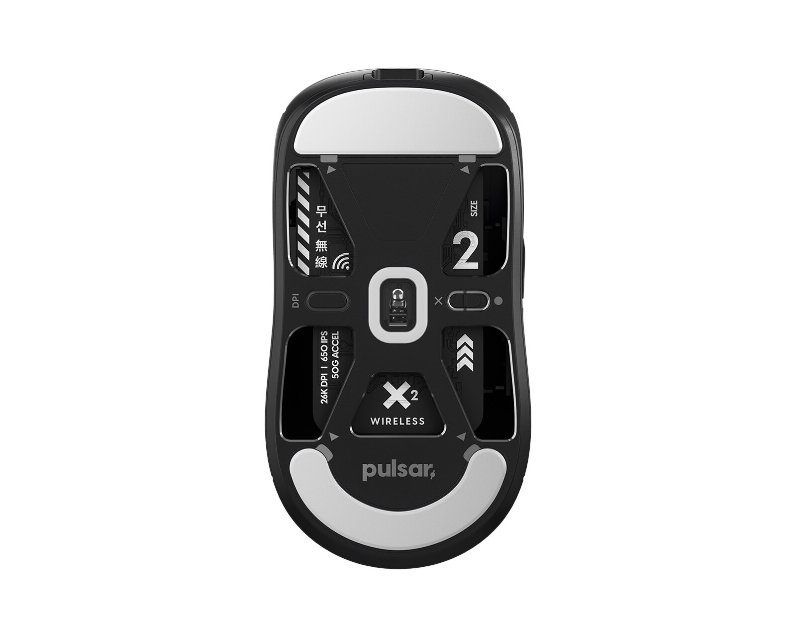 Pulsar X2 оснащена новейшим сенсором PIXArt PAW3395, способным работать со скоростью 650 IPS, ускорением 50g, 26 000 DPI и частотой опроса 1000hz / 1ms. Это самый высокопроизводительный оптический сенсор для игровой мыши.