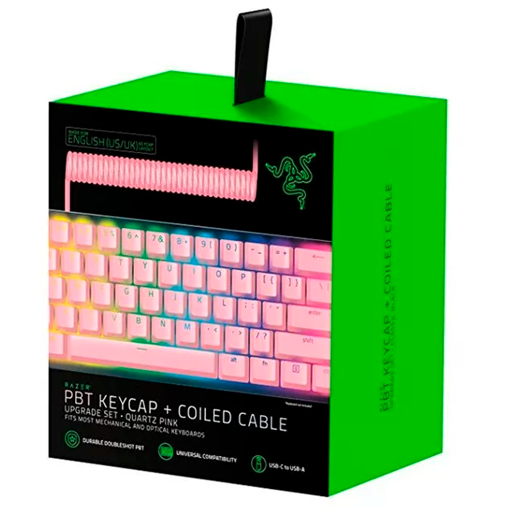 Сделанные из премиального PBT пластика методом двойного литья, кейкапы от Razer не оставят вас равнодушными. Эти кейкапы не изнашиваются и начинают со временем блестеть, а значит прослужат вам долгие годы. Кроме того набор содержит в себе спиралевидный кабель в оплётке с таком же цвете, как и сами кейкапы.