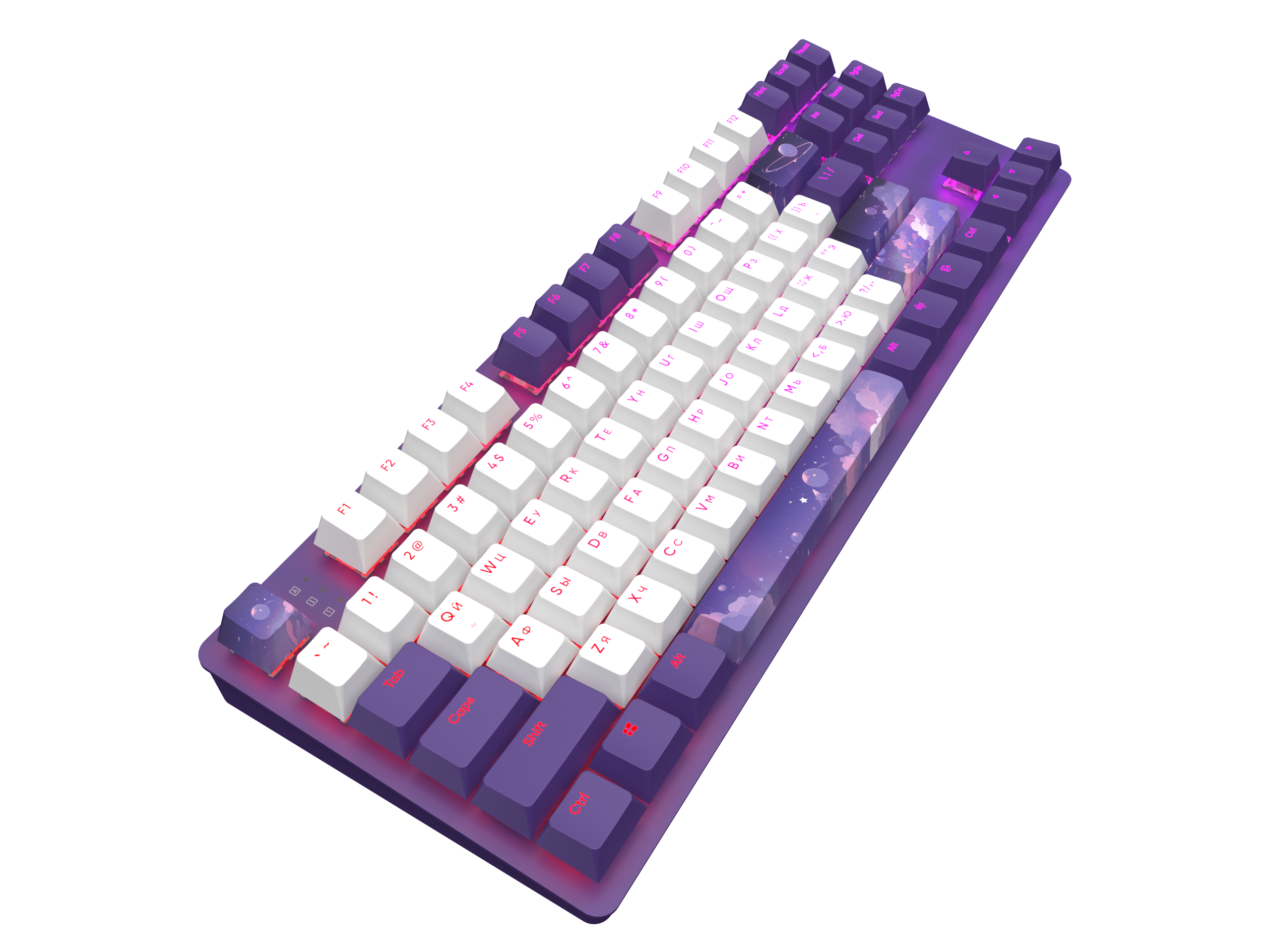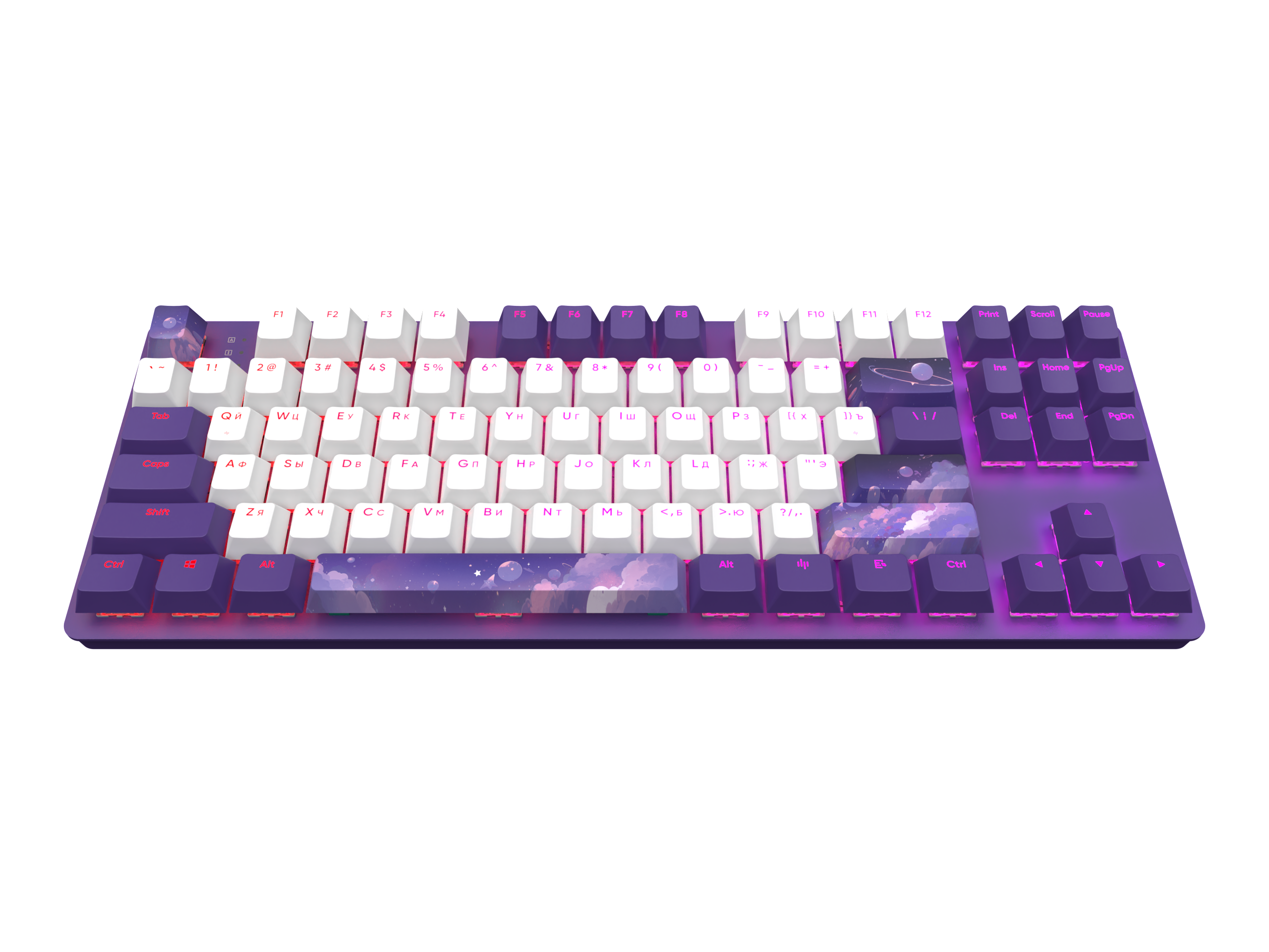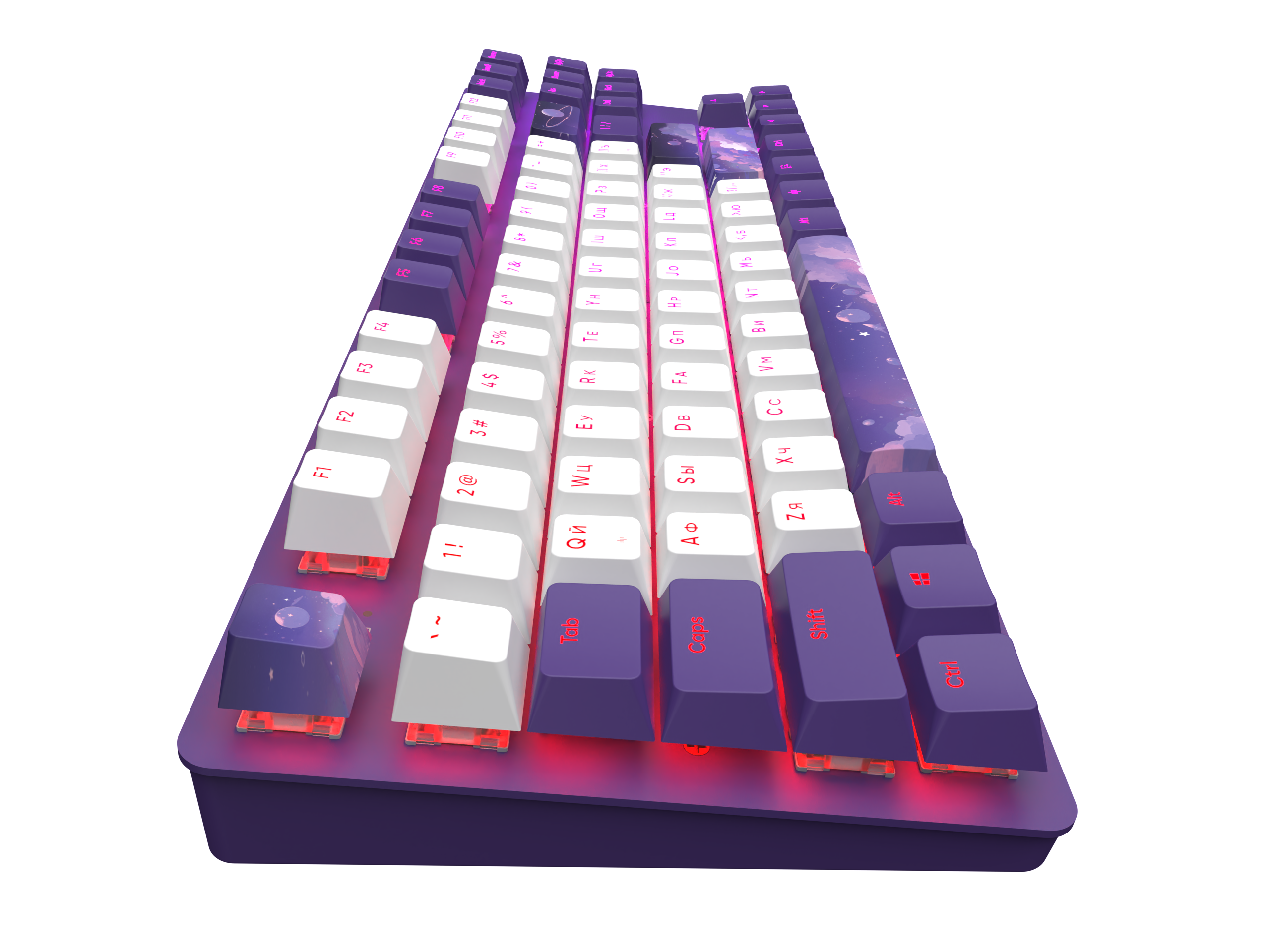 Клавиатура Red Square Keyrox TKL Hyperion оформлена в фиолетовом и белом цветах. К тому же на некоторых клавишах изображено ночное небо, которое создает крайне необычный и притягательный стиль.