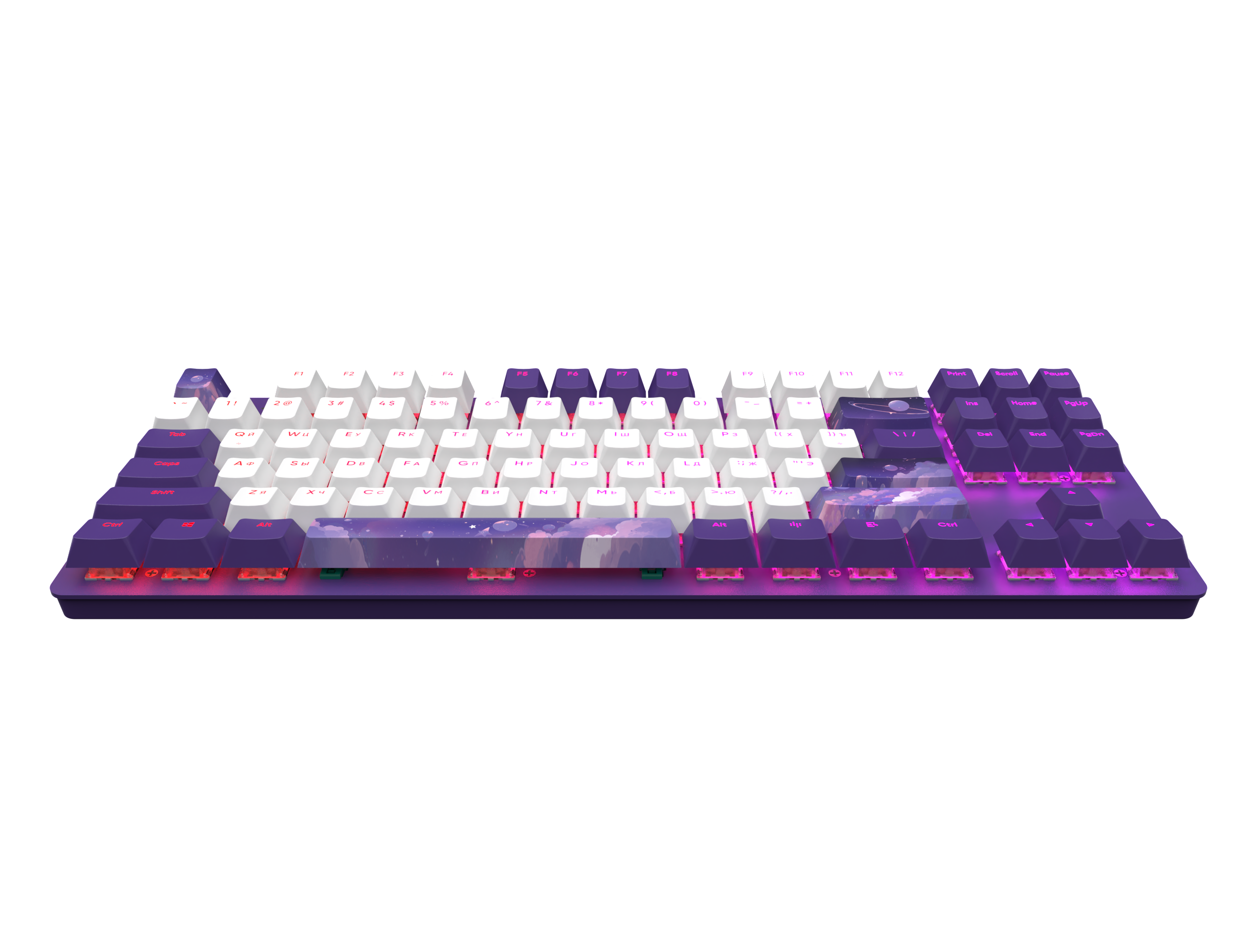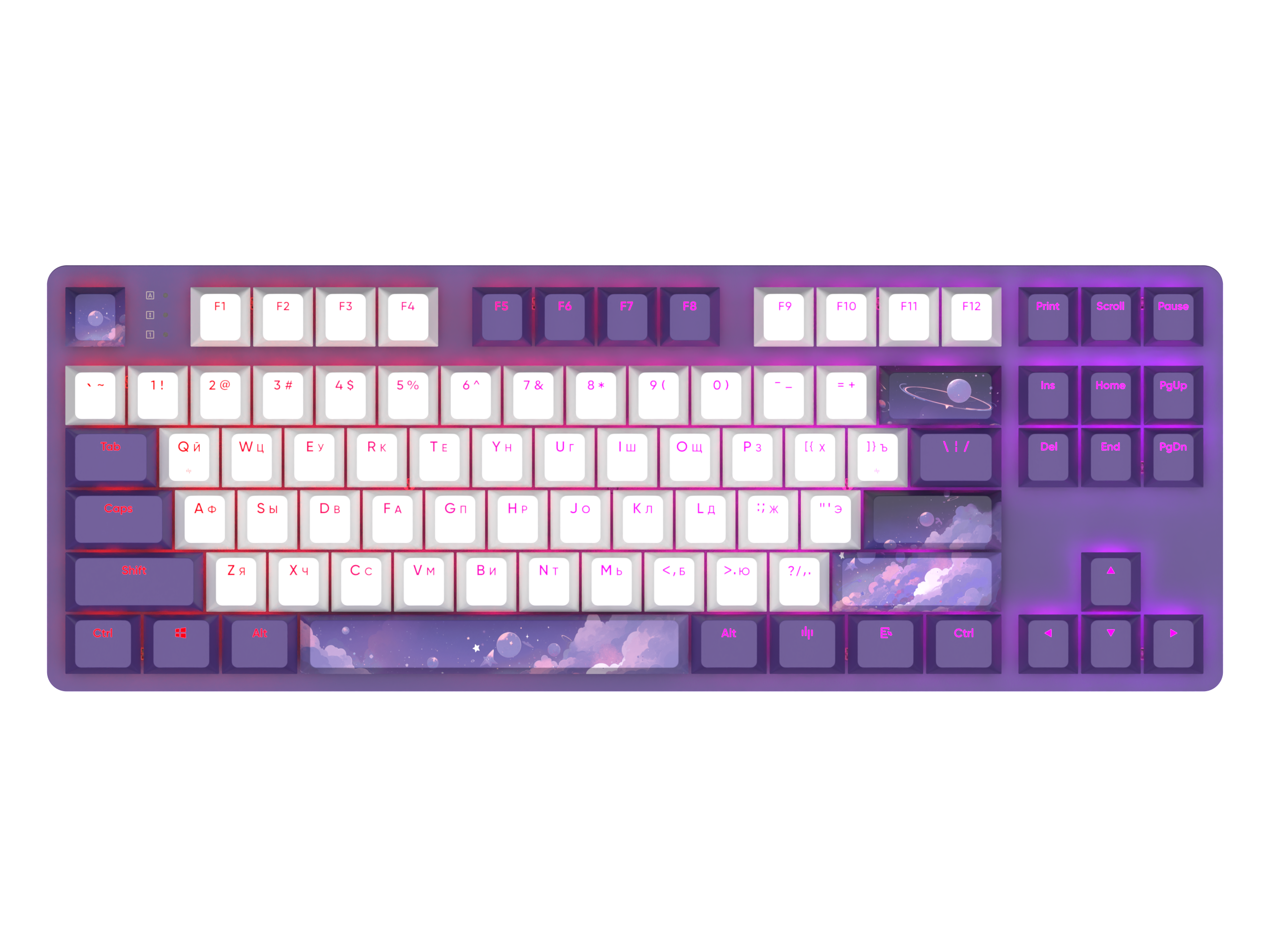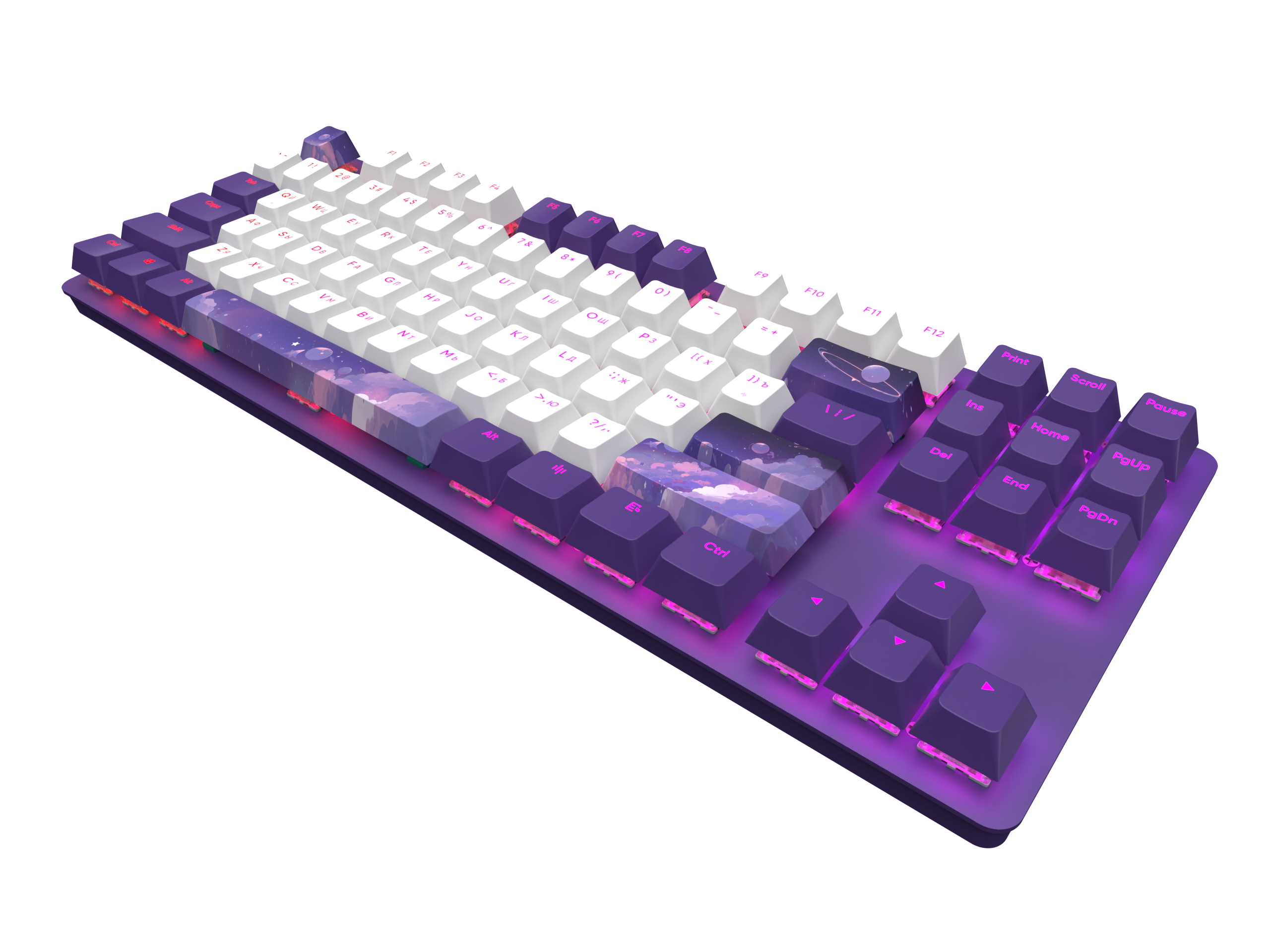 Клавиатура Red Square Keyrox TKL Hyperion оформлена в фиолетовом и белом цветах. К тому же на некоторых клавишах изображено ночное небо, которое создает крайне необычный и притягательный стиль.