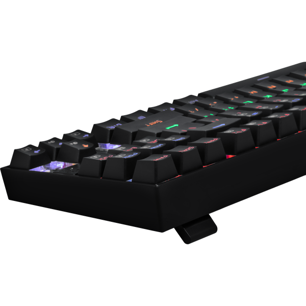 Классический дизайн клавиатуры с профилем клавиш Cherry дополняется RGB-подсветкой с регулируемой яркостью. Клавиши на голубых свитчах обеспечивают звонкий щелчок переключателей при нажатии. Клавиатура аппаратно блокирует клавишу Win во время игры, а клавиши WASD могут использовать как стрелки при коротком нажатии.
