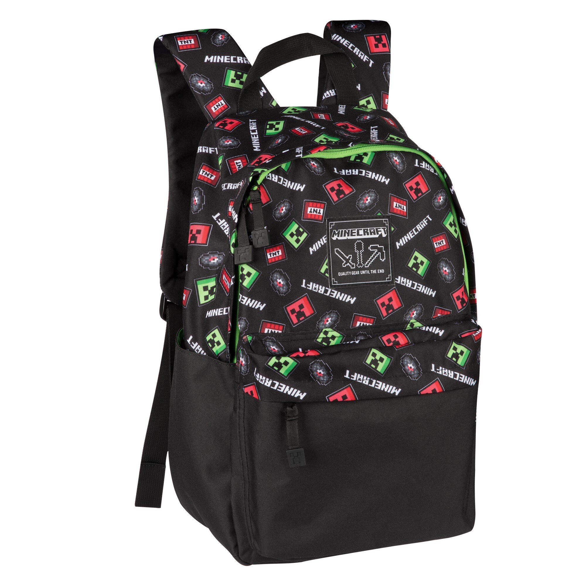 - Черный рюкзак идеально подходит для фаната Minecraft. У него отличные детали, с повторяющимся рисунком Minecraft из Creepers и TNT блоков и контрастным зеленой отделкой.